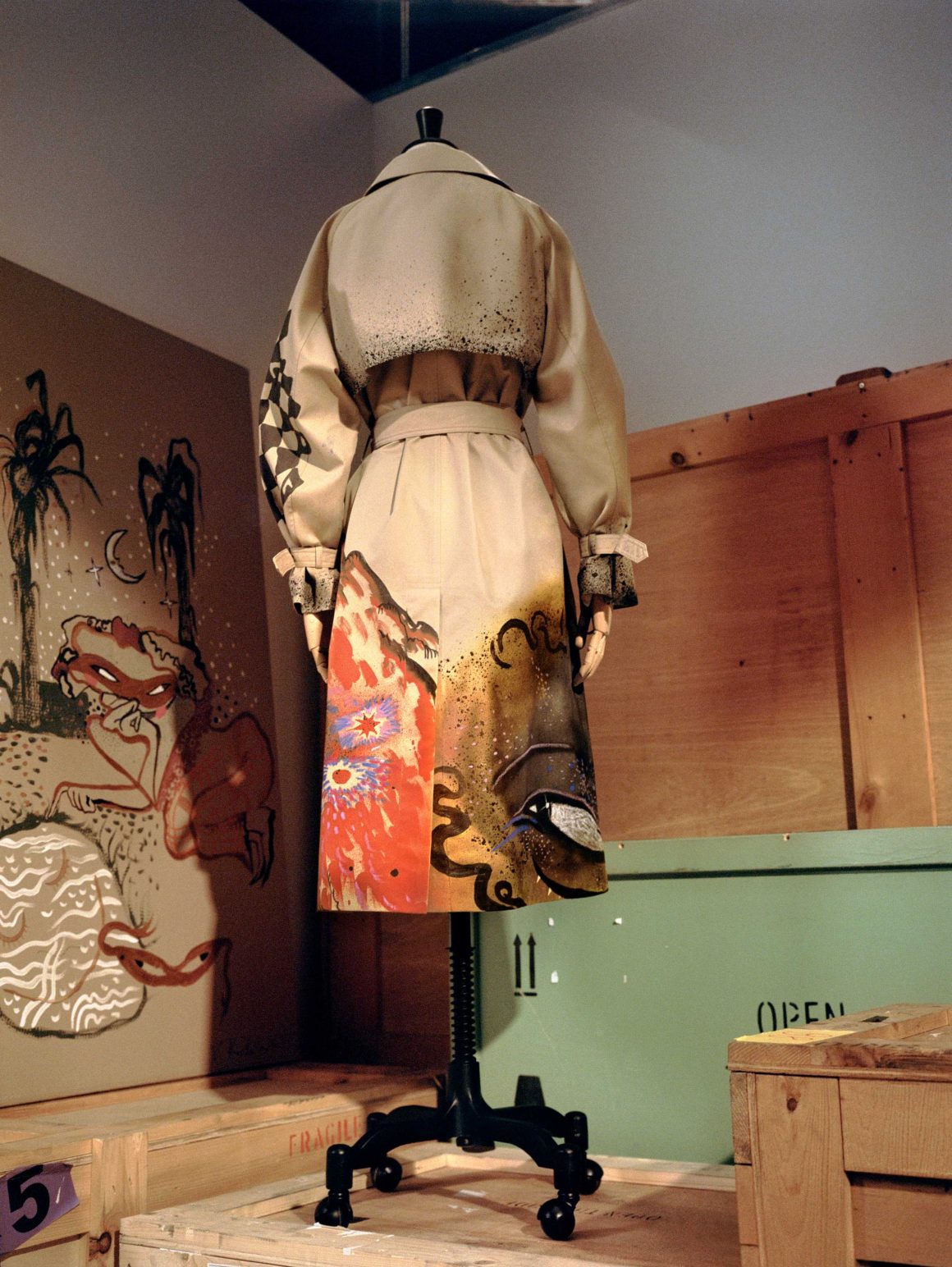 Victoria Kosheleva, who merges contemporary and classical imagery in what she describes as “cyber expressionism,” worked directly on a prototype, painting various motifs that Weekend Max Mara later reproduced as a print. For Kosheleva, a trench coat is not just a garment—it’s