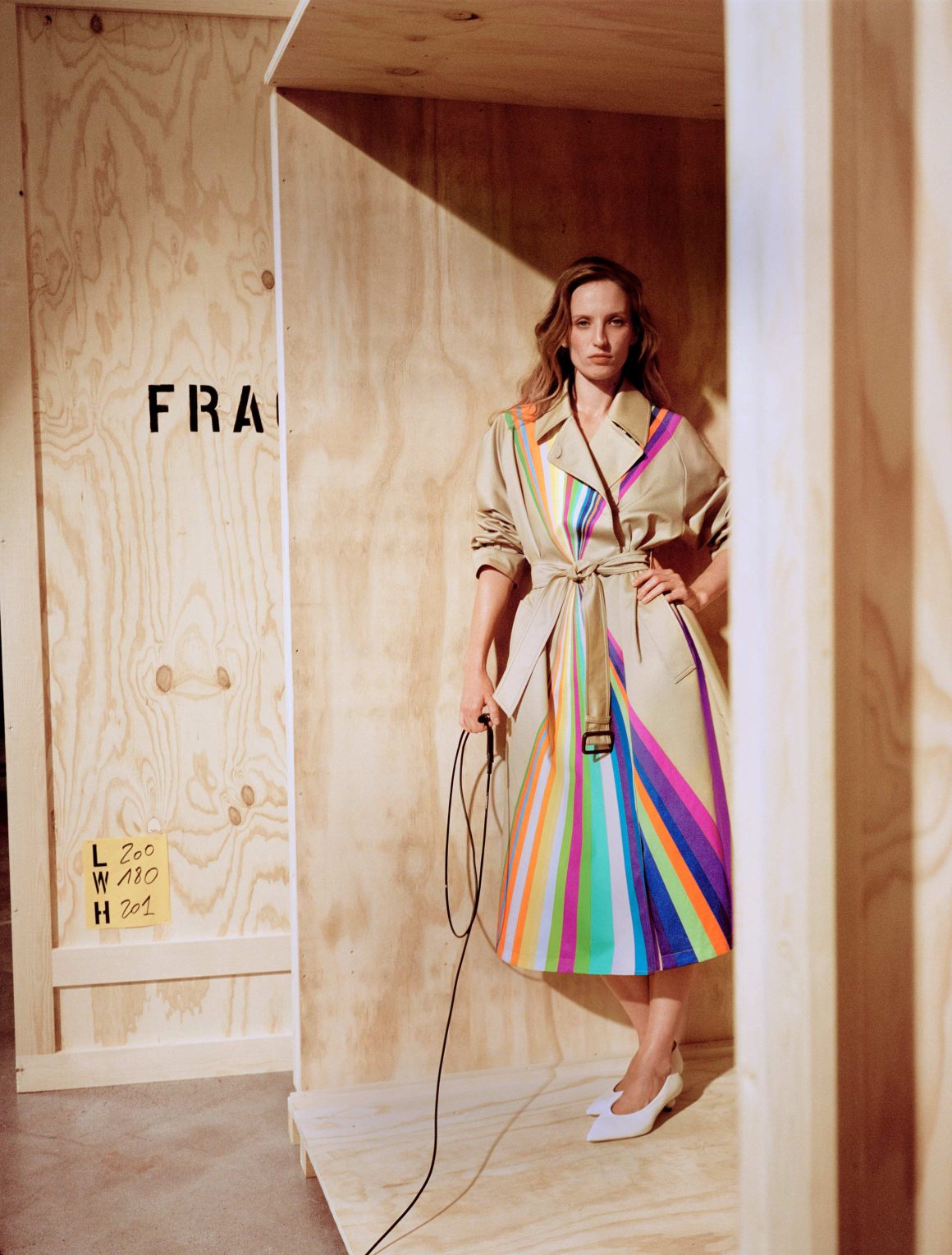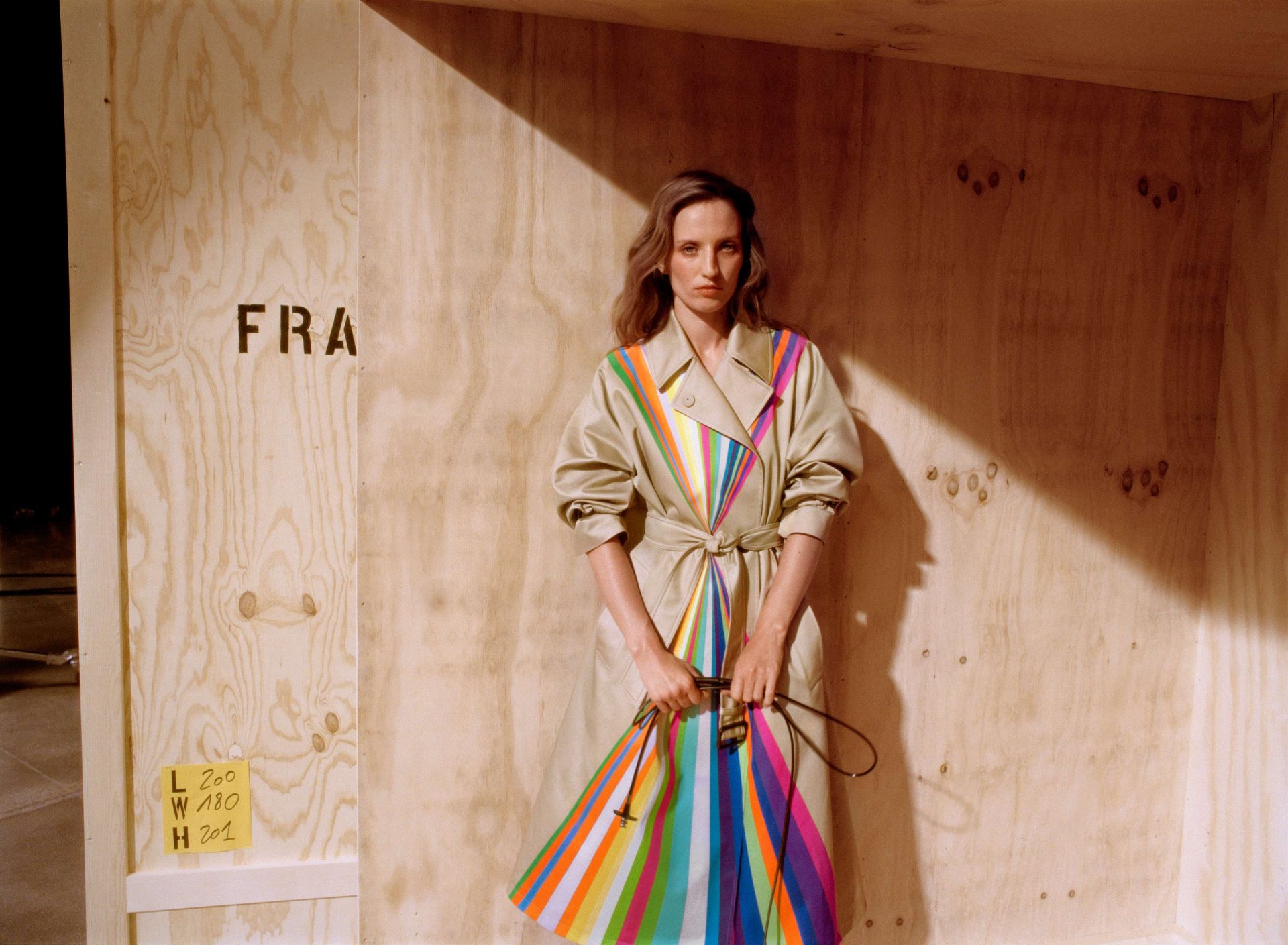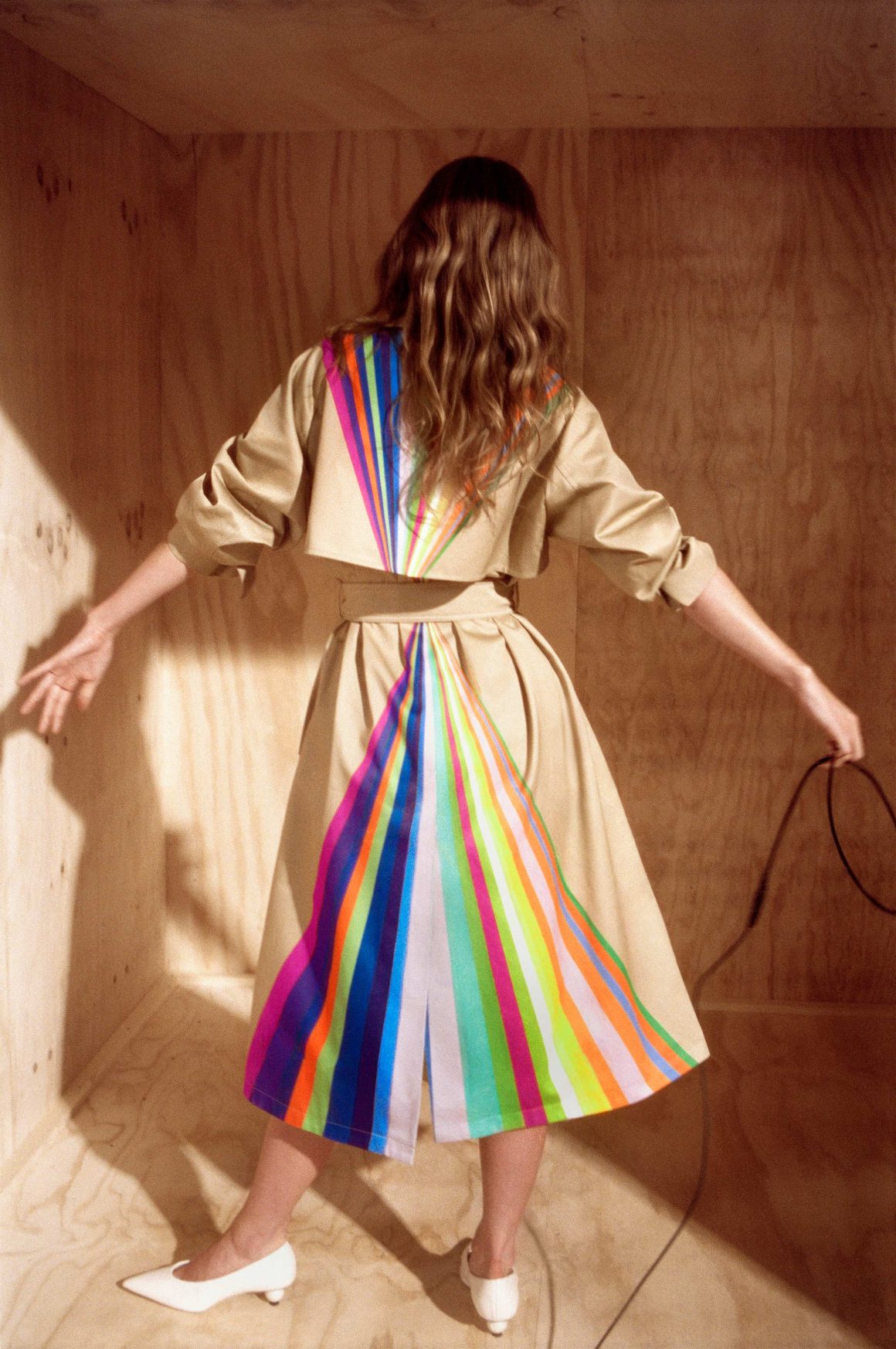 Italian artist Paola Pivi often incorporates everyday objects into her art, altering their characteristics to prompt the audience to reevaluate their perspective on reality. Currently residing in lush Hawaii, she finds inspiration in the island’s beautiful, full light, the power and intensity of the colors that tint the flora and fauna, and, above all, from the double rainbows that arc across the sky almost daily, integrating them into her trench design. These natural wonders inspired the vertical multi-colored stripes that cascade down the front and back of the trench,