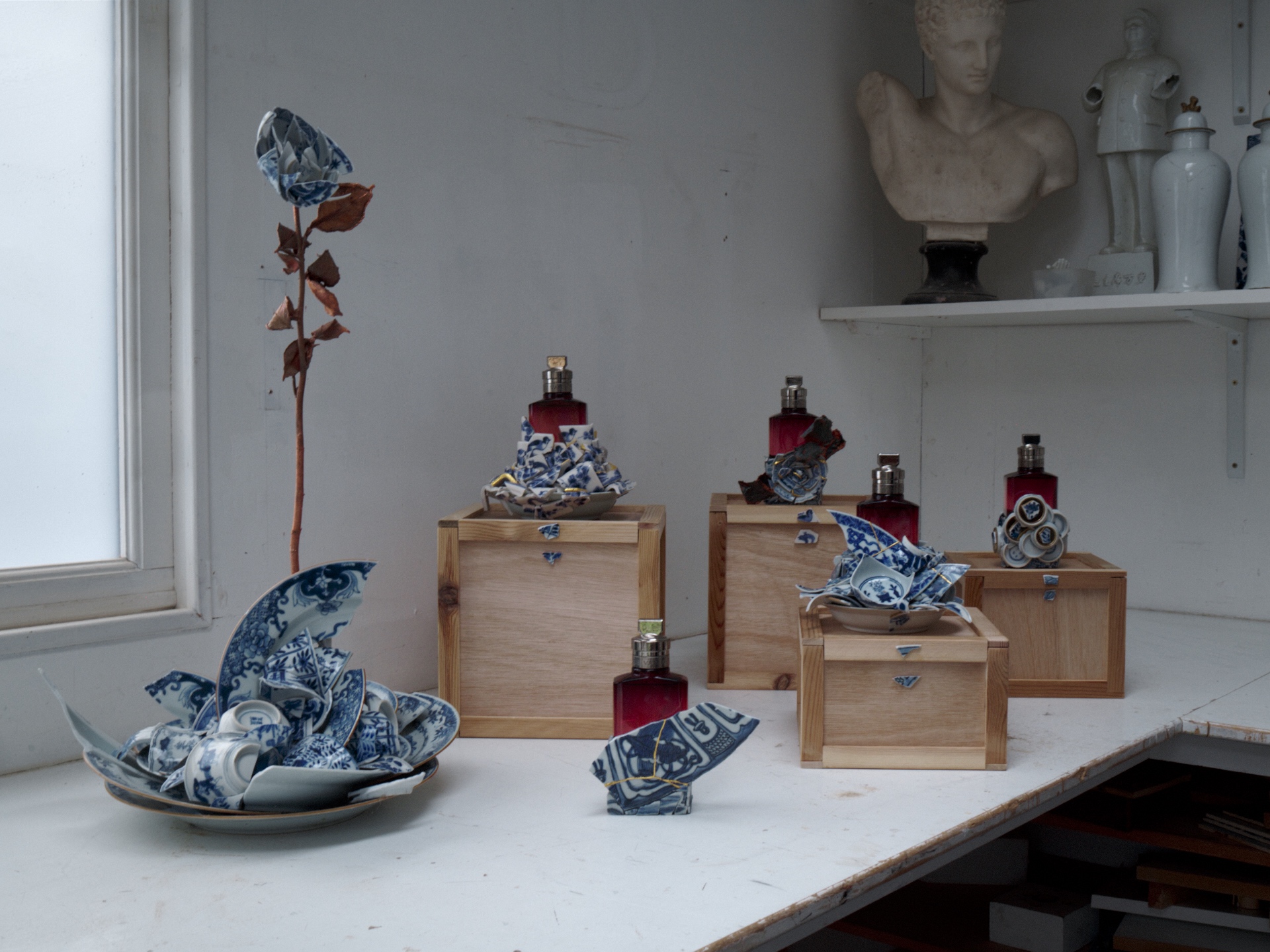 The resulting works feel like warped, theatrical variations on the original Soie Malaquais bottle. Each piece begins with the same blue-and-white porcelain base, which appears caught mid-shatter: shards cracked open and coaxed into new silhouettes, the breaks deliberately visible. The artist leans into a language of fracture and repair, using the Japanese Kintsugi technique, mending cracks with gold lacquer so they’re highlighted rather than hidden.