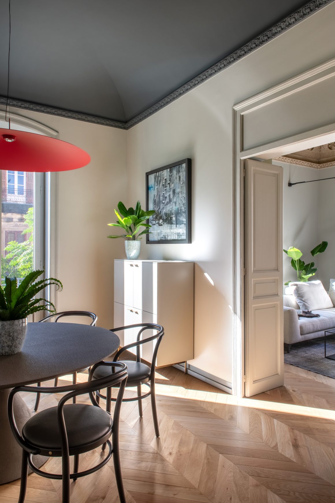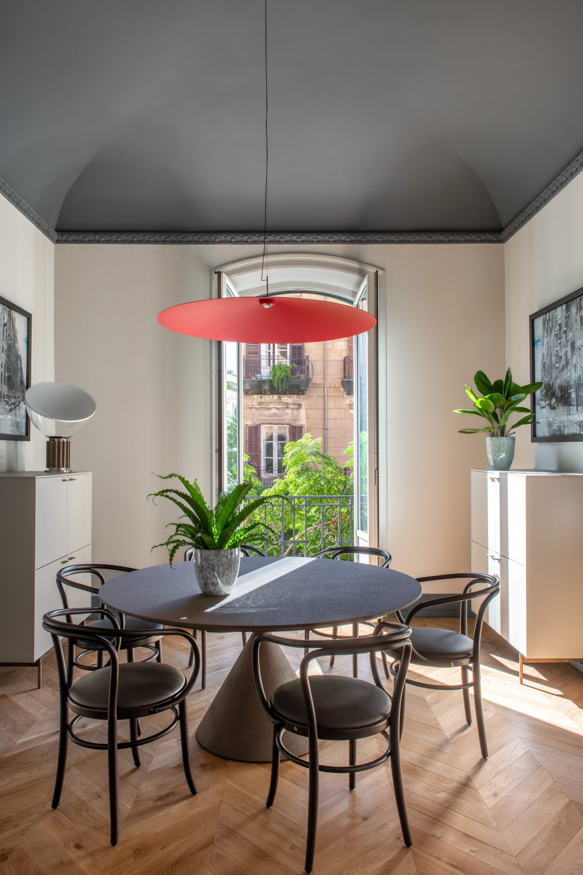 Στην τραπεζαρία, η αναρτώμενη λάμπα Koinè της Luceplan αναδεικνύει την κάθετη διάσταση του χώρου με την κομψή δίχρωμη σχεδίασή της, σε αρμονία με το διπλανό καθιστικό. Το τραπέζι Clay της Desalto συνοδεύεται από τις ιστορικές καρέκλες 209 M της Thonet, δημιουργώντας ισορροπία ανάμεσα σε σχέδια διαφορετικών εποχών.