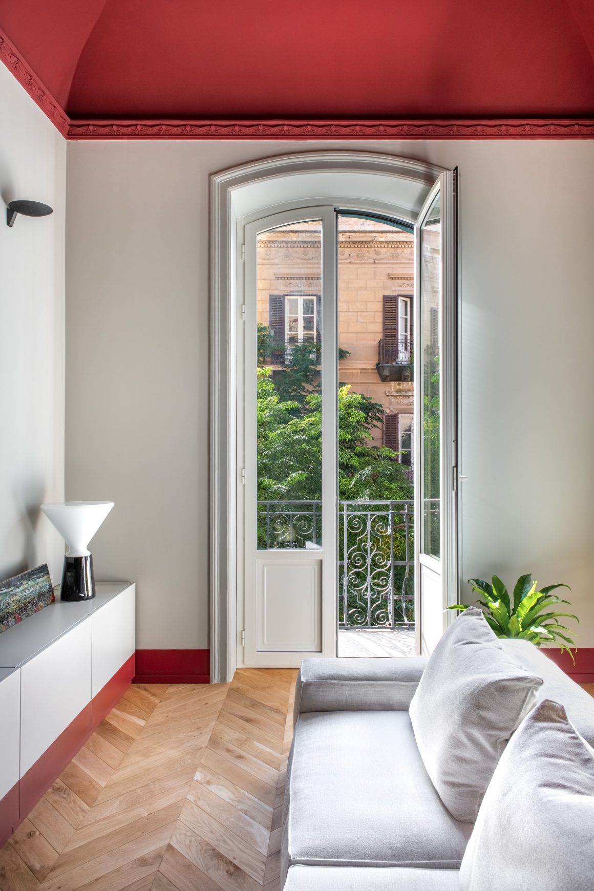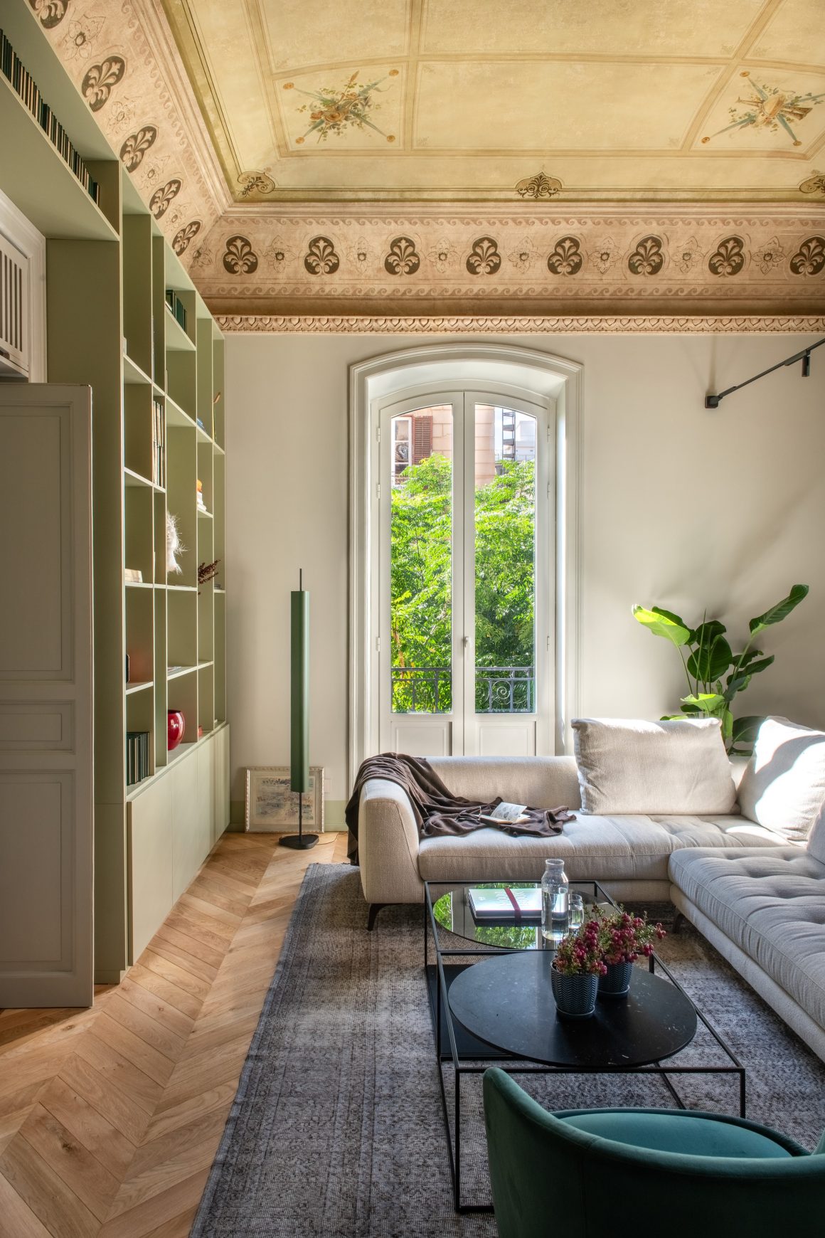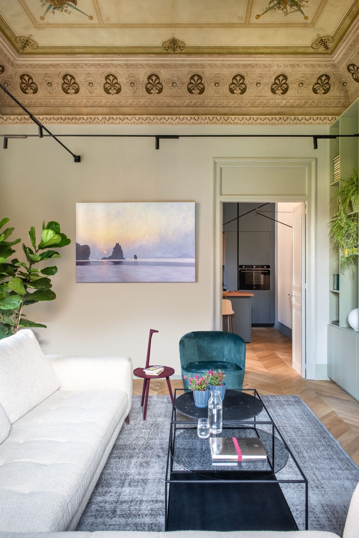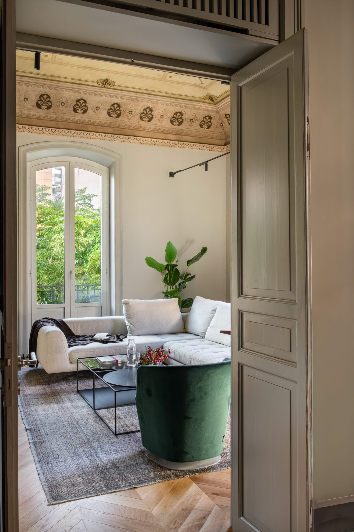 Σεβόμενοι τη διάταξη enfilade, η περιοχή διαβίωσης επανασχεδιάστηκε πλήρως: η κουζίνα μεταφέρθηκε και τοποθετήθηκε σε άμεσο διάλογο με το σαλόνι, αναδεικνυόμενη στον κοινωνικό πυρήνα του σπιτιού. Από τον ευρύχωρο προθάλαμο με την καμάρα οροφής, οδηγείται κανείς σε μια σειρά τριών χώρων—επίσης με καμάρες και άνοιγμα σε μπαλκόνια—που συνθέτουν το κύριο καθιστικό, ενώ ένας διάδρομος συνδέει την κρεβατοκάμαρα.