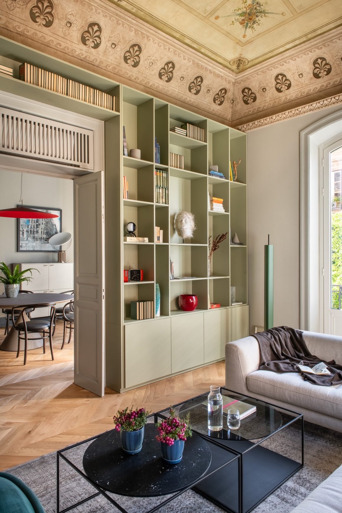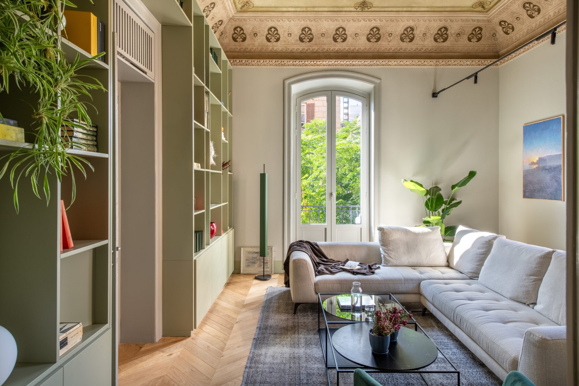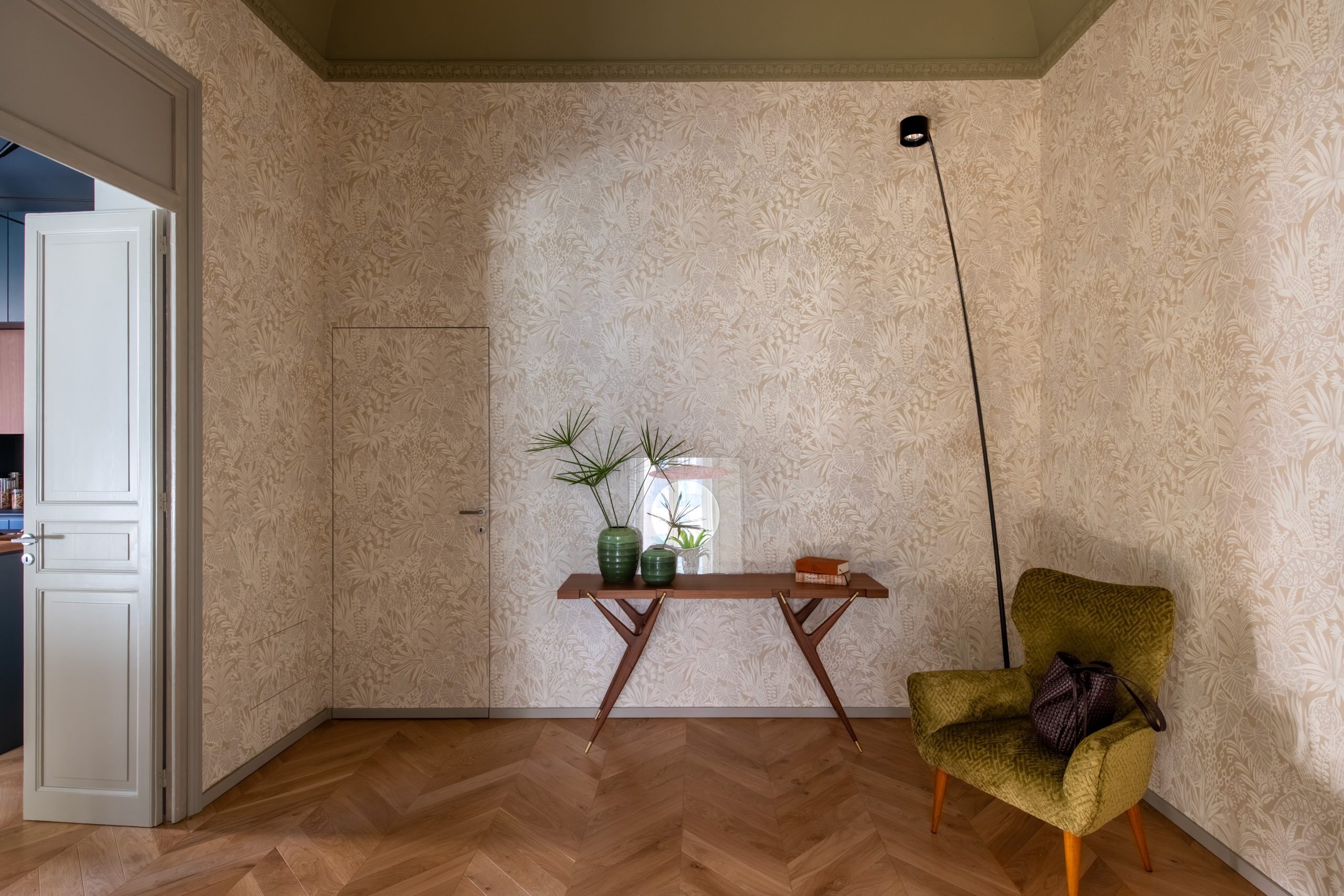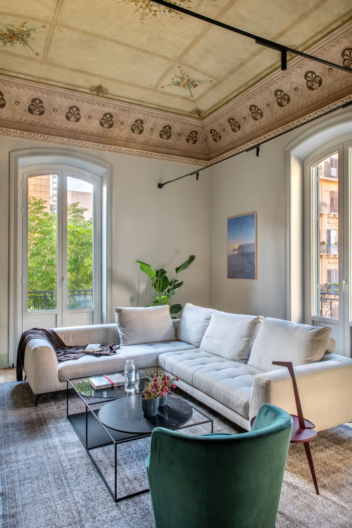 Σεβόμενοι τη διάταξη enfilade, η περιοχή διαβίωσης επανασχεδιάστηκε πλήρως: η κουζίνα μεταφέρθηκε και τοποθετήθηκε σε άμεσο διάλογο με το σαλόνι, αναδεικνυόμενη στον κοινωνικό πυρήνα του σπιτιού. Από τον ευρύχωρο προθάλαμο με την καμάρα οροφής, οδηγείται κανείς σε μια σειρά τριών χώρων—επίσης με καμάρες και άνοιγμα σε μπαλκόνια—που συνθέτουν το κύριο καθιστικό, ενώ ένας διάδρομος συνδέει την κρεβατοκάμαρα.