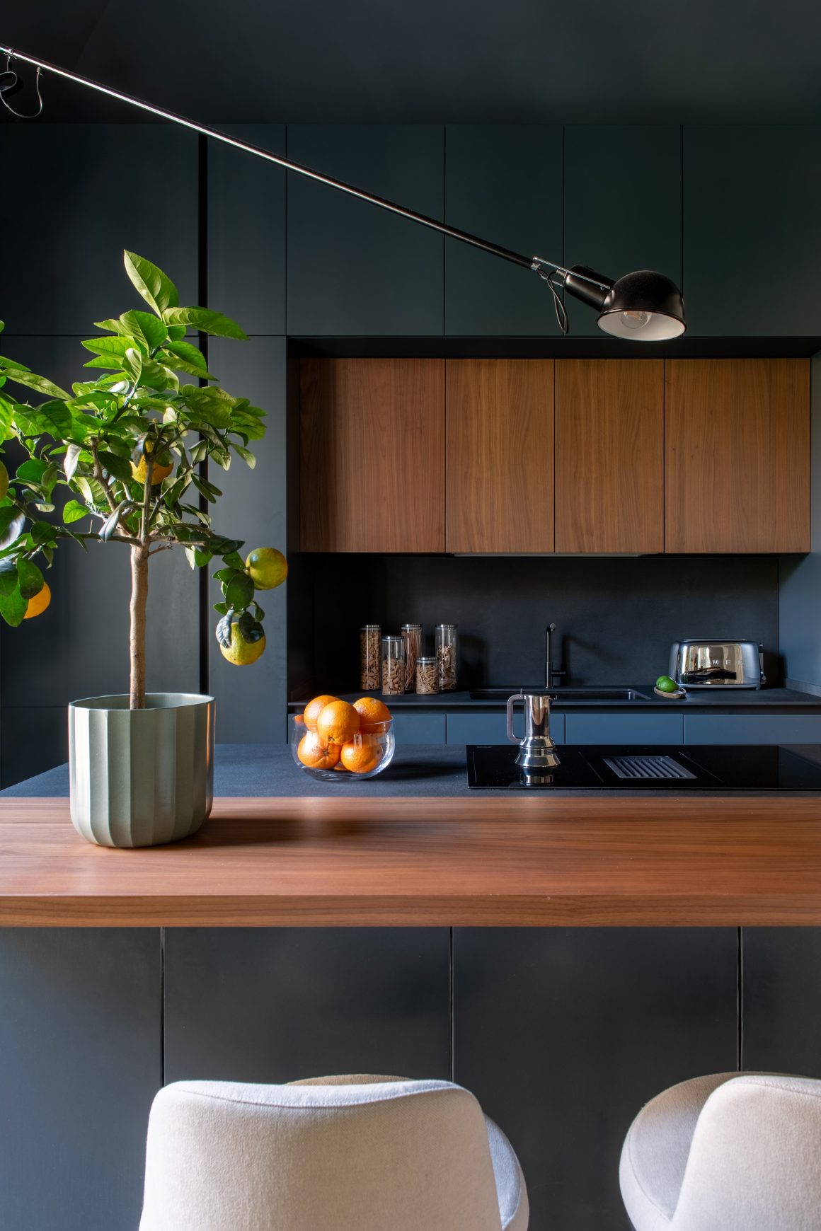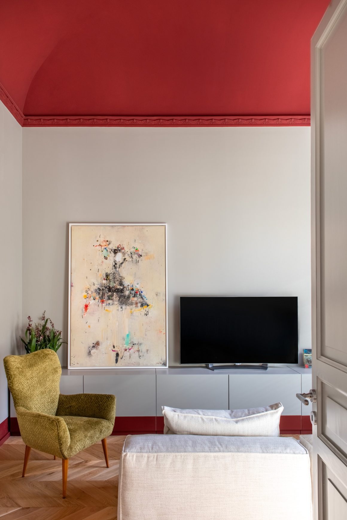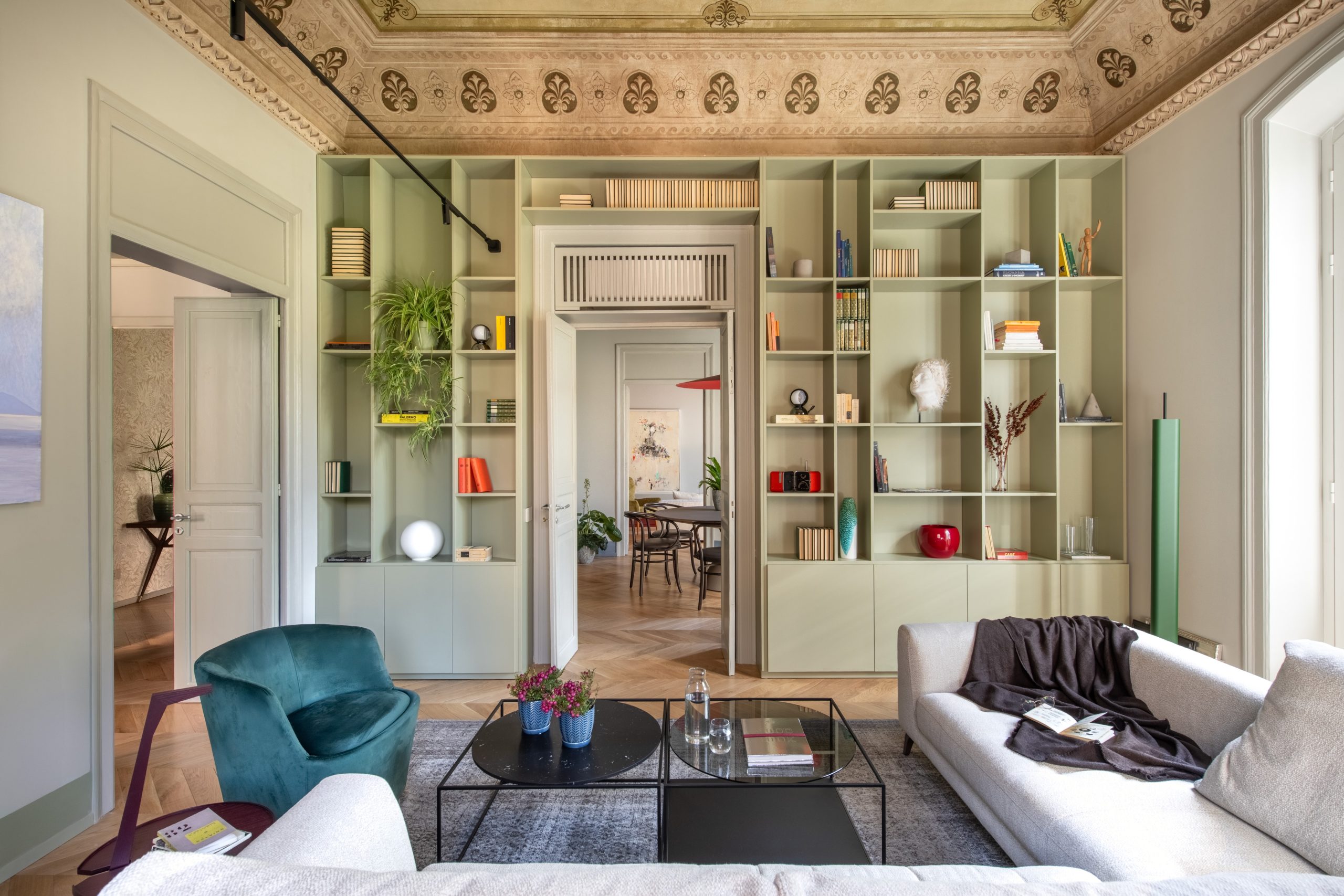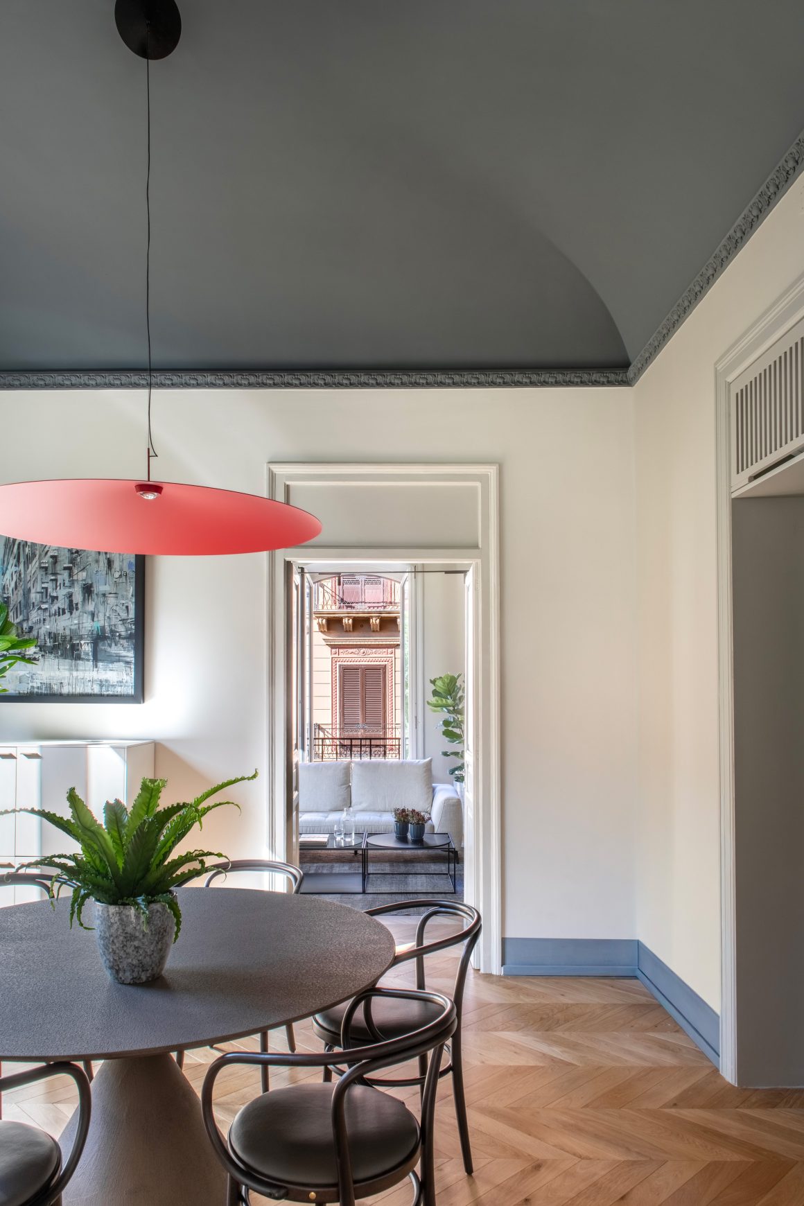 Κάθε δωμάτιο χαρακτηρίζεται από έναν κυρίαρχο τόνο, ακολουθώντας την 19ου αιώνα παράδοση του χρωματικού συντονισμού καμάρων και ποδιών. Η κουζίνα, σε βαθιούς τόνους του μπλε, διαθέτει μεγάλο κεντρικό νησί με ξύλινες επιφάνειες για σνακ και φωτίζεται από τις εμβληματικές αναρτήσεις 265 της Flos, που συνδιαλέγονται εντυπωσιακά με τη μεγαλοπρεπή καμάρα ύψους άνω των τεσσάρων μέτρων.