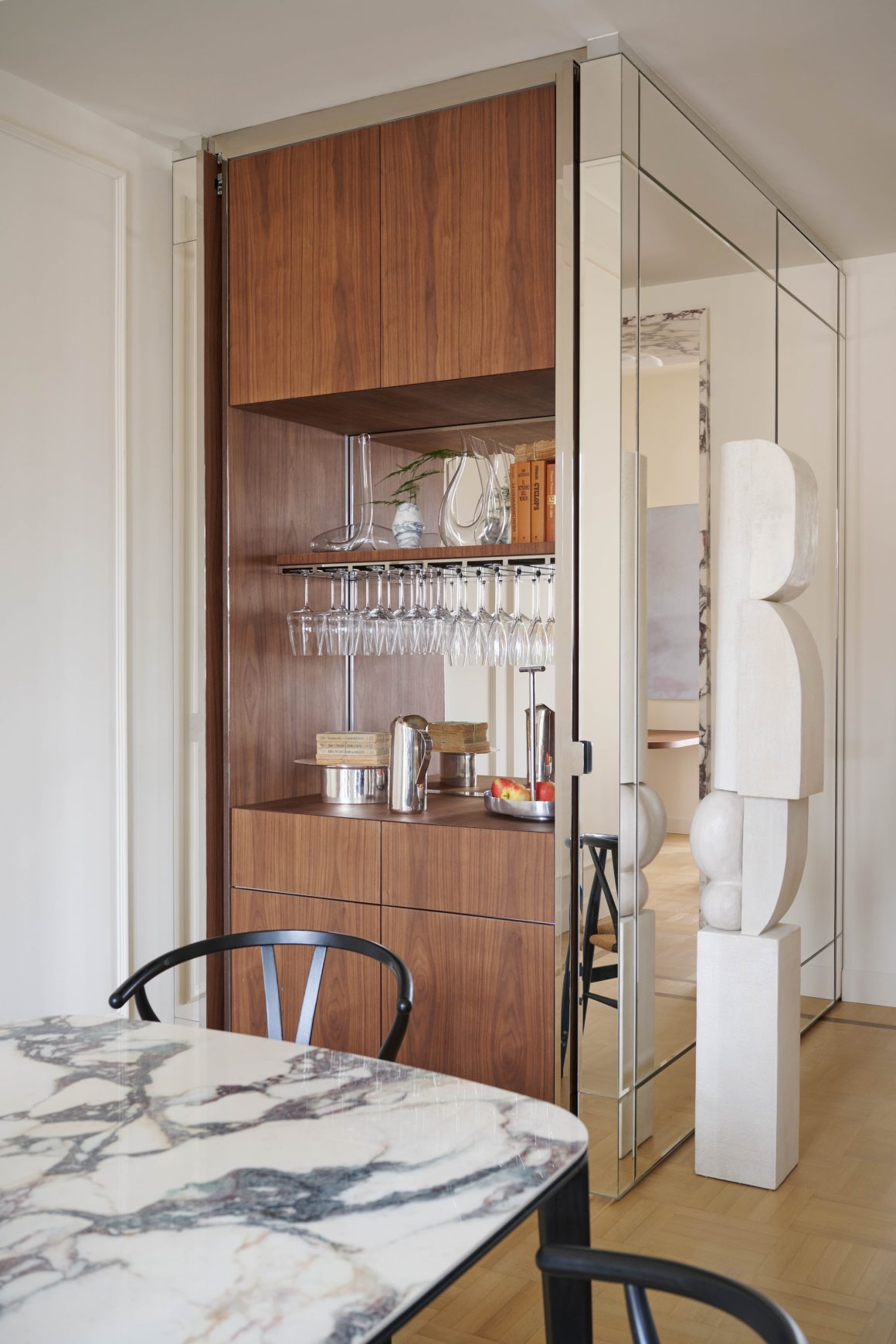 Ένας τρίτος όγκος, επενδεδυμένος με εξαιρετικά διαυγές λοξοκομμένο καθρέφτη, αντανακλά γλυπτά του Paul Bik και ένα εμβληματικό φωτιστικό του Achille Castiglioni. Πρόκειται για μια σκηνογραφική αλλά ταυτόχρονα μετρημένη χειρονομία, που κρύβει ένα μπαρ από καρυδιά, την είσοδο προς τη ζώνη ύπνου και πολλαπλασιάζει το φως. Ο διάδρομος που οδηγεί στην κουζίνα μετατρέπεται έτσι σε έναν χώρο προς κατοίκηση, με εντοιχισμένο πάγκο επενδεδυμένο με εκλεκτό ύφασμα Lizzo, απλίκες της Louis Poulsen και το υλικό έργο Green Ink του Paolo Fiore.