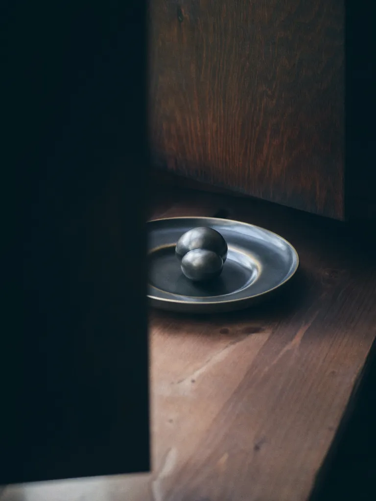 Η υλικότητα διαδραματίζει κεντρικό ρόλο. Βάζα και φωτιστικά από ορείχαλκο και μπρούντζο συνυπάρχουν με κουτιά από όνυχα και χειροποίητα, φυσητά ιριδίζοντα γυάλινα αγγεία. Πλεκτά καλάθια επιμεταλλώνονται με ασήμι, ενώ χειρολακαρισμένα κομμάτια αποκαλύπτουν την ακρίβεια και τον πλούτο των παραδοσιακών τεχνικών. Σε όλη τη συλλογή, τα φινιρίσματα βρίσκονται σε διάλογο — διαφάνεια και αδιαφάνεια, λάμψη και ματ υφή, πυκνότητα και φωταύγεια — δημιουργώντας μια λεπτή ένταση που καθορίζει τον οπτικό και απτικό της χαρακτήρα.