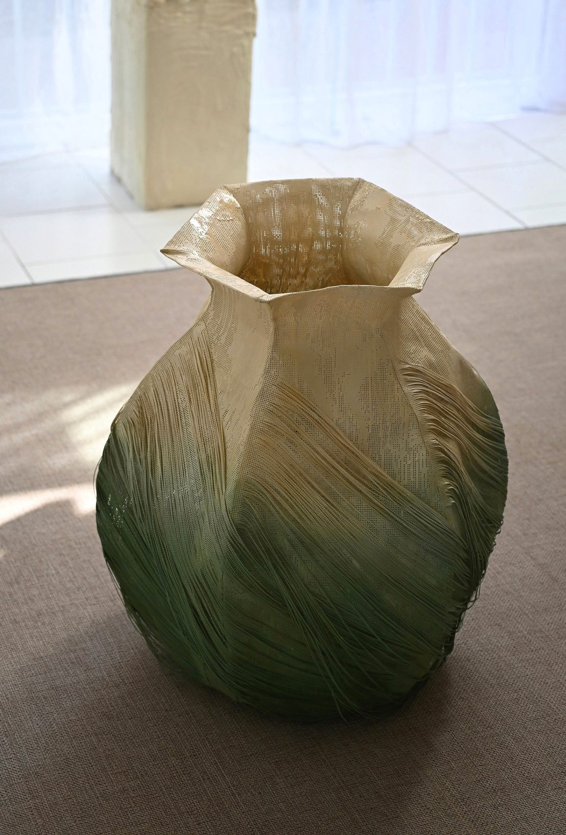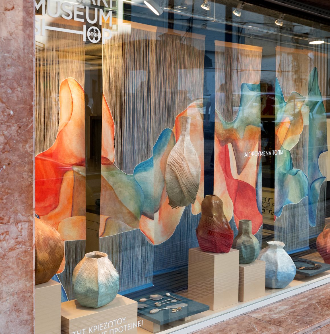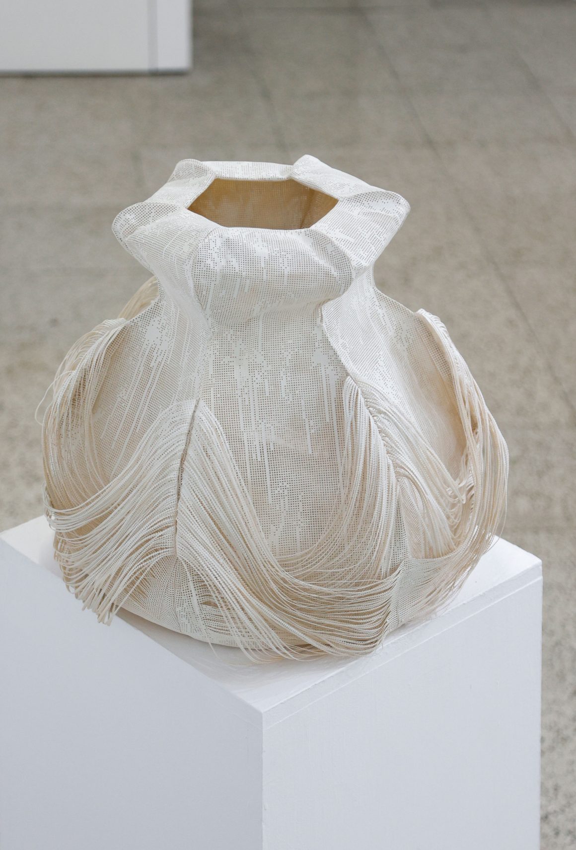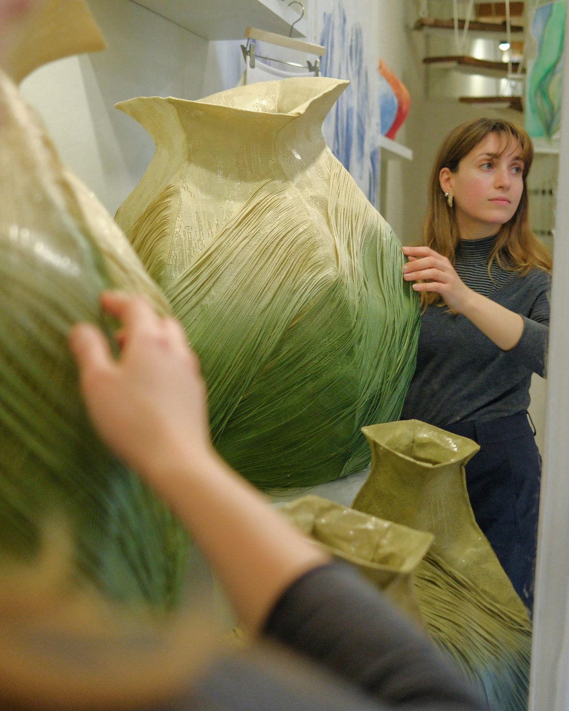 Πέρα από τα abstract γλυπτά μου, έχω δημιουργήσει και μια σειρά design αντικειμένων που παραπέμπουν σε βάζα, τα οποία αποκαλώ κιούπια. Είναι κατασκευασμένα από καμβά σταυροβελονιάς και ξεκίνησαν από κάτι που με απασχολεί: τα υφάσματα, τα κεντήματα και τα υφαντά της παράδοσής μας καταλήγουν συχνά κρυμμένα σε συρτάρια, χωρίς να αναδεικνύουν την ομορφιά τους. Θέλησα να δώσω στο ύφασμα μια αφορμή να βγει στο προσκήνιο, να κατακτήσει τον χώρο με τον ίδιο τρόπο που το κάνει ένα κεραμικό αντικείμενο.