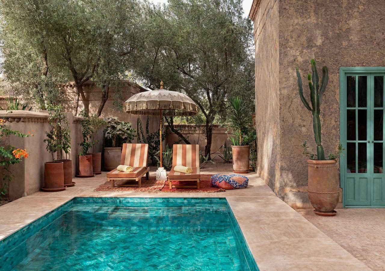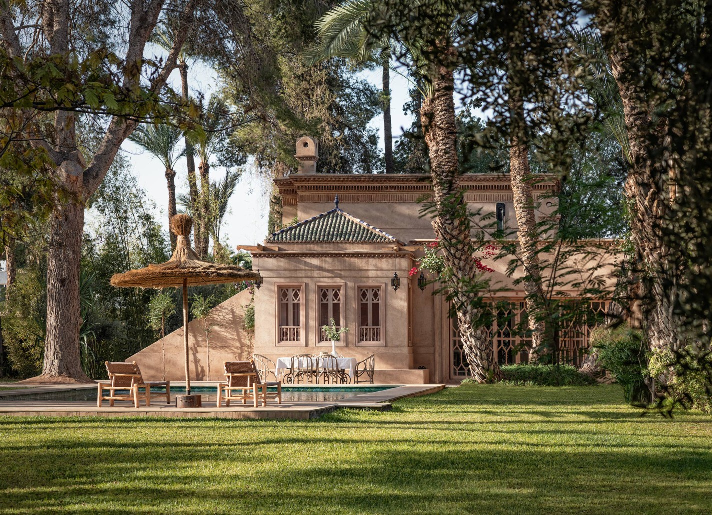 Μια μαροκινή ιδιοκτησία κρυμμένη πίσω από χωμάτινους τοίχους και καταρράκτες από βουκαμβίλιες, χωρίς κανένα προφανές ίχνος της καλλιτεχνικής έκφρασης που κρύβεται πίσω τους. Μόλις μπει κανείς μέσα, περνώντας ανάμεσα σε υφασμένα ελαιόδεντρα και ψηλούς φοίνικες, νιώθει αμέσως ότι τον καλωσορίζουν σε έναν χώρο ταυτόχρονα ιδιωτικό και φιλόξενο.