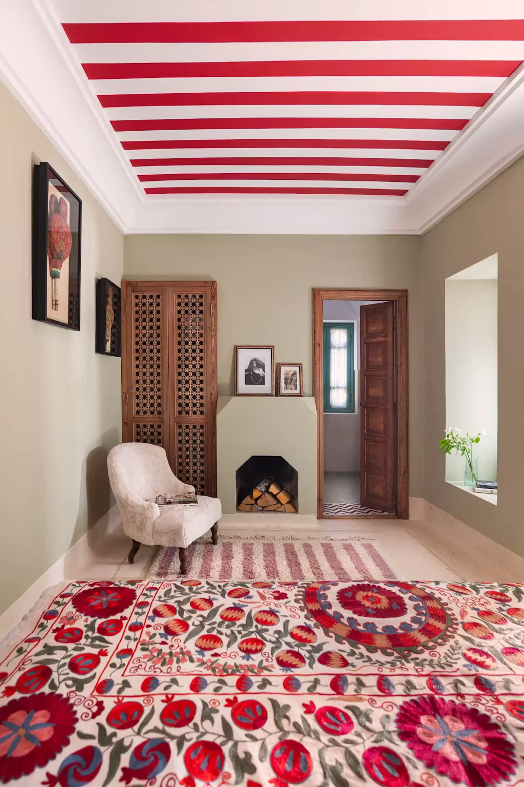 Οι τοίχοι του Jnane Rumi παρουσιάζουν σίγουρα μια χαρούμενη και εκλεκτική συλλογή τέχνης – έργα που διασχίζουν ηπείρους και γεφυρώνουν την παράδοση με τη σύγχρονη εποχή. Τα χαλιά που καλύπτουν τους χώρους και τους διαδρόμους είναι εξίσου μαγευτικά: εκείνη η έντονη κίτρινη απόχρωση κάτω από την πράσινη οροφή, οι γεωμετρικές ροζ υφάνσεις με νότες τυρκουάζ στο νήμα – υπέροχο!