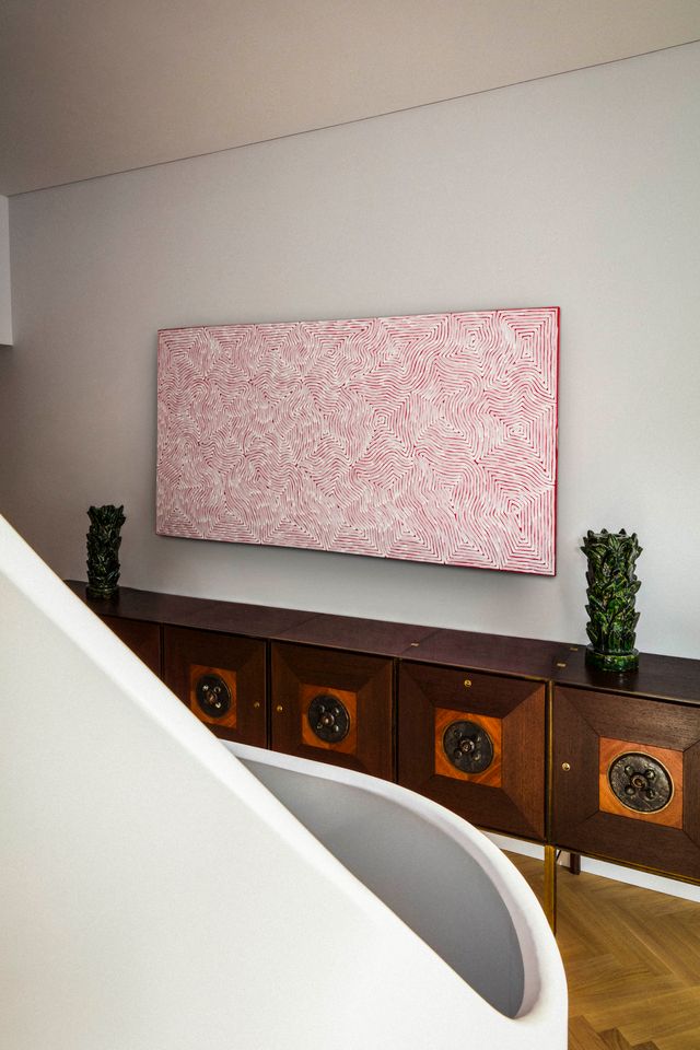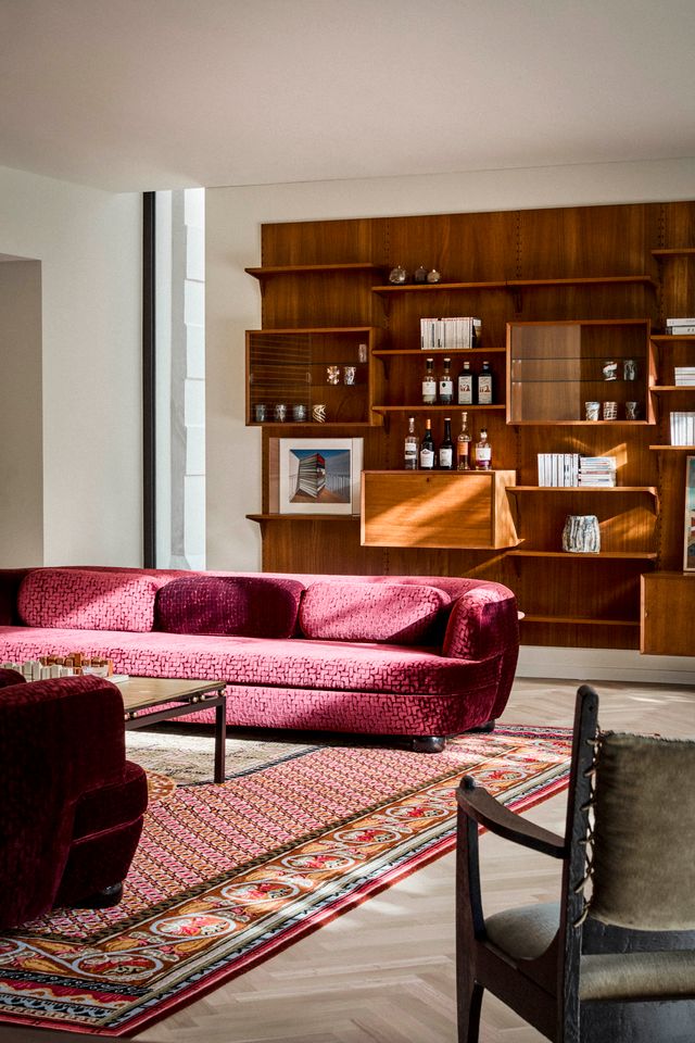 Το καθιστικό οργανώνεται με πολυτελείς βελούδινους καναπέδες σε αποχρώσεις του berry, των οποίων η απαλή υφή προσθέτει ζεστασιά και κομψότητα. Το έργο του Peter Halley, με έντονους κόκκινους και πορτοκαλί τόνους, συμπληρώνει χρωματικά τον χώρο, δημιουργώντας έναν αρμονικό οπτικό ρυθμό. Ένα αντικέ χαλί με περίτεχνα μοτίβα σε μπορντό, ώχρα και φυσικές ξύλινες αποχρώσεις δένει όλα τα στοιχεία, γεφυρώνοντας το παρελθόν με το σύγχρονο design.