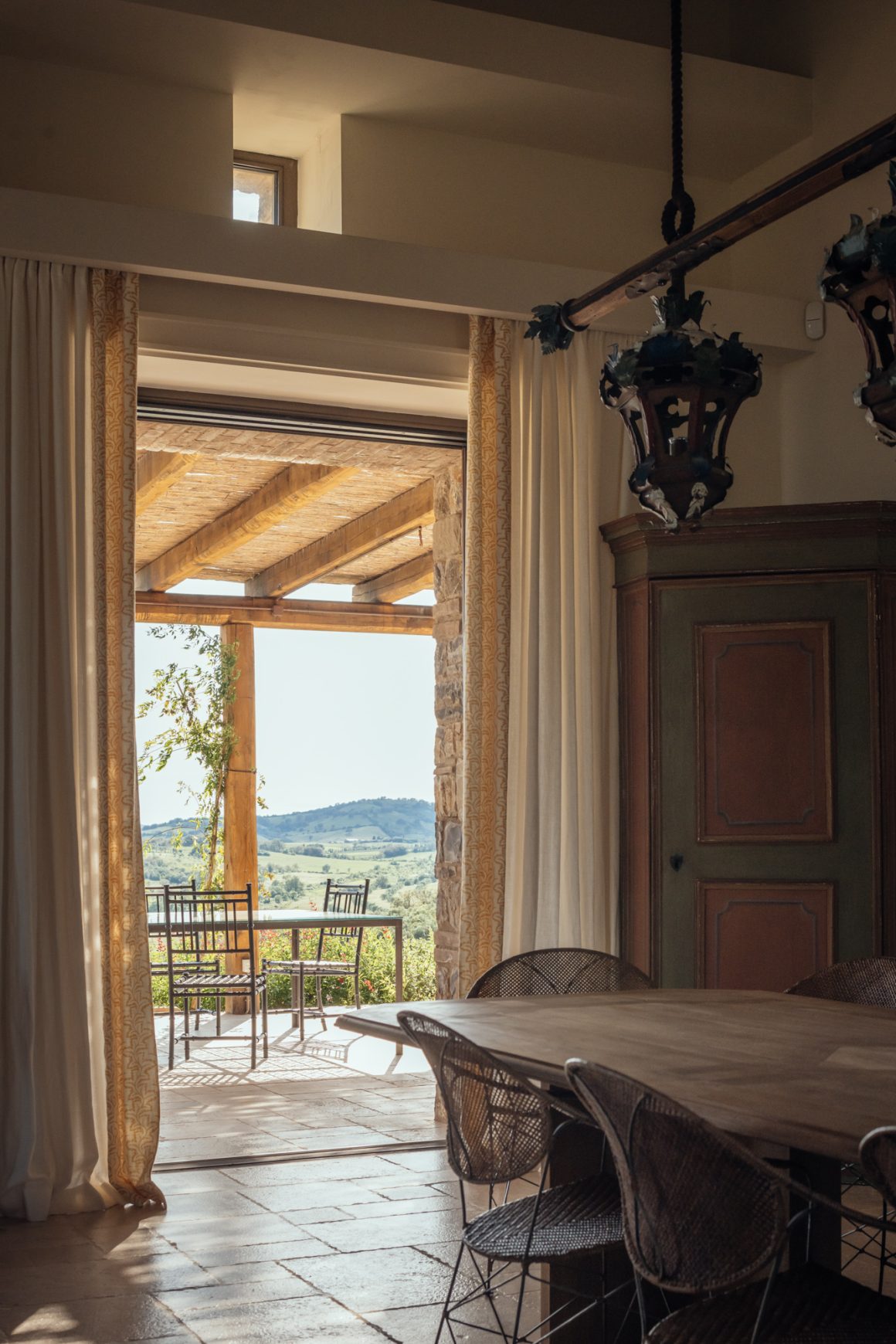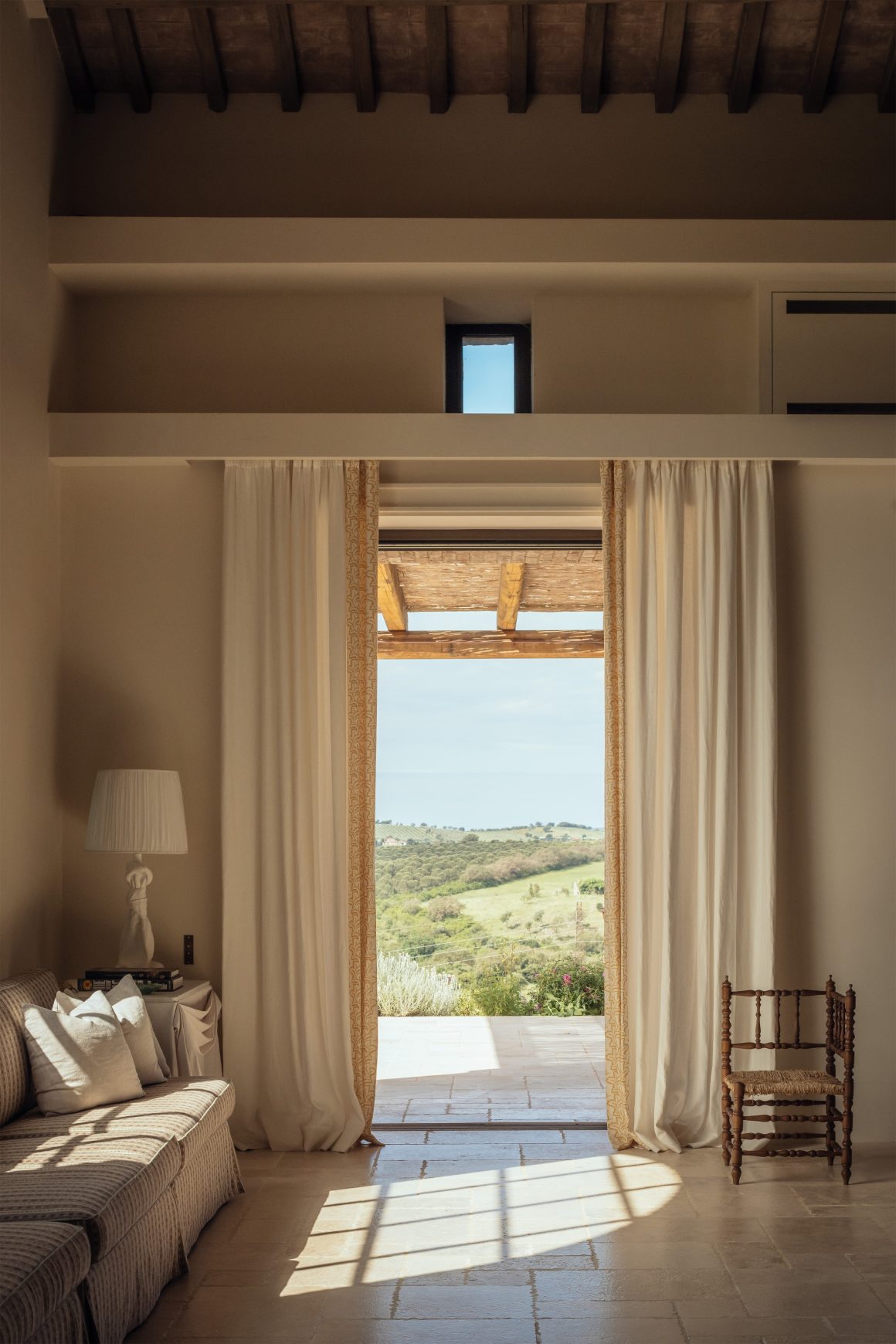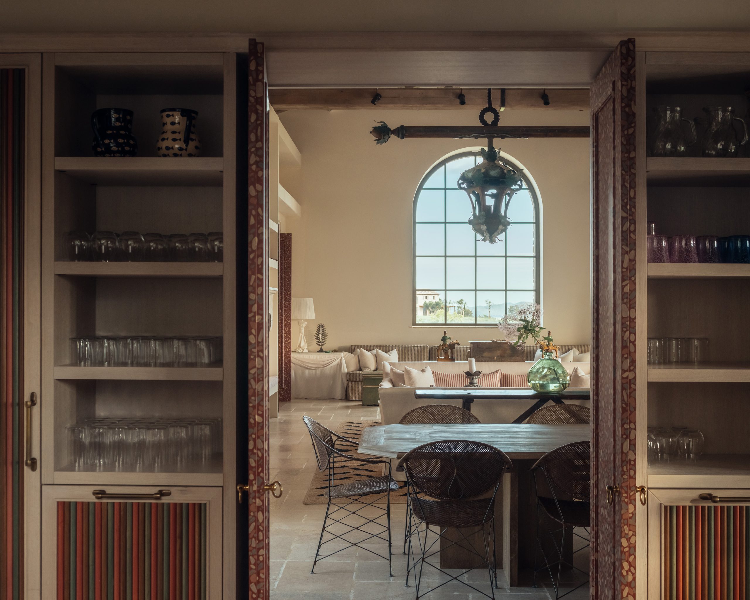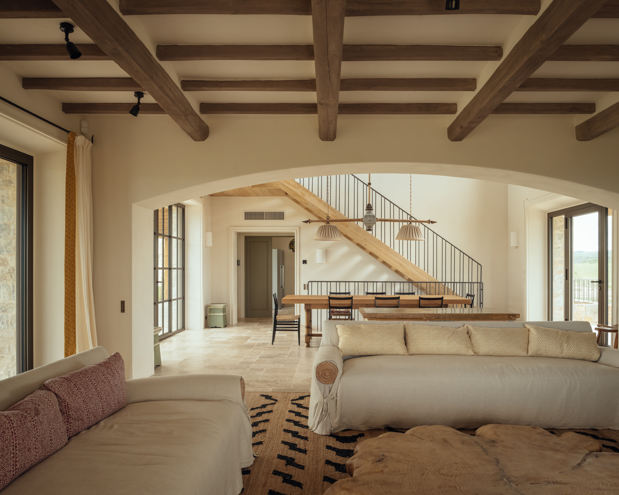 Οι εσωτερικοί χώροι αναπτύχθηκαν αρχικά από τον Tommaso Ziffer σε συνεργασία με το Studio GAA Architects. Αργότερα, ένα ισπανικό στούντιο εσωτερικής διακόσμησης ανέλαβε τη λεπτομερή διαμόρφωση των εσωτερικών χώρων και της διακοσμητικής κλίμακας. Αντικέ έπιπλα συνδυάζονται με φρεσκοβαμμένες πόρτες και ταβάνια, σε συνδυασμό με τις ανοιχτές θέες προς το τοπίο. Αυτά τα επίπεδα στοιχείων εμπλουτίζουν τους χώρους χωρίς να υπερκαλύπτουν τη διακριτική αρχιτεκτονική, επιτρέποντας στο φως, στις αναλογίες και στο περιβάλλον να παραμένουν στο επίκεντρο.