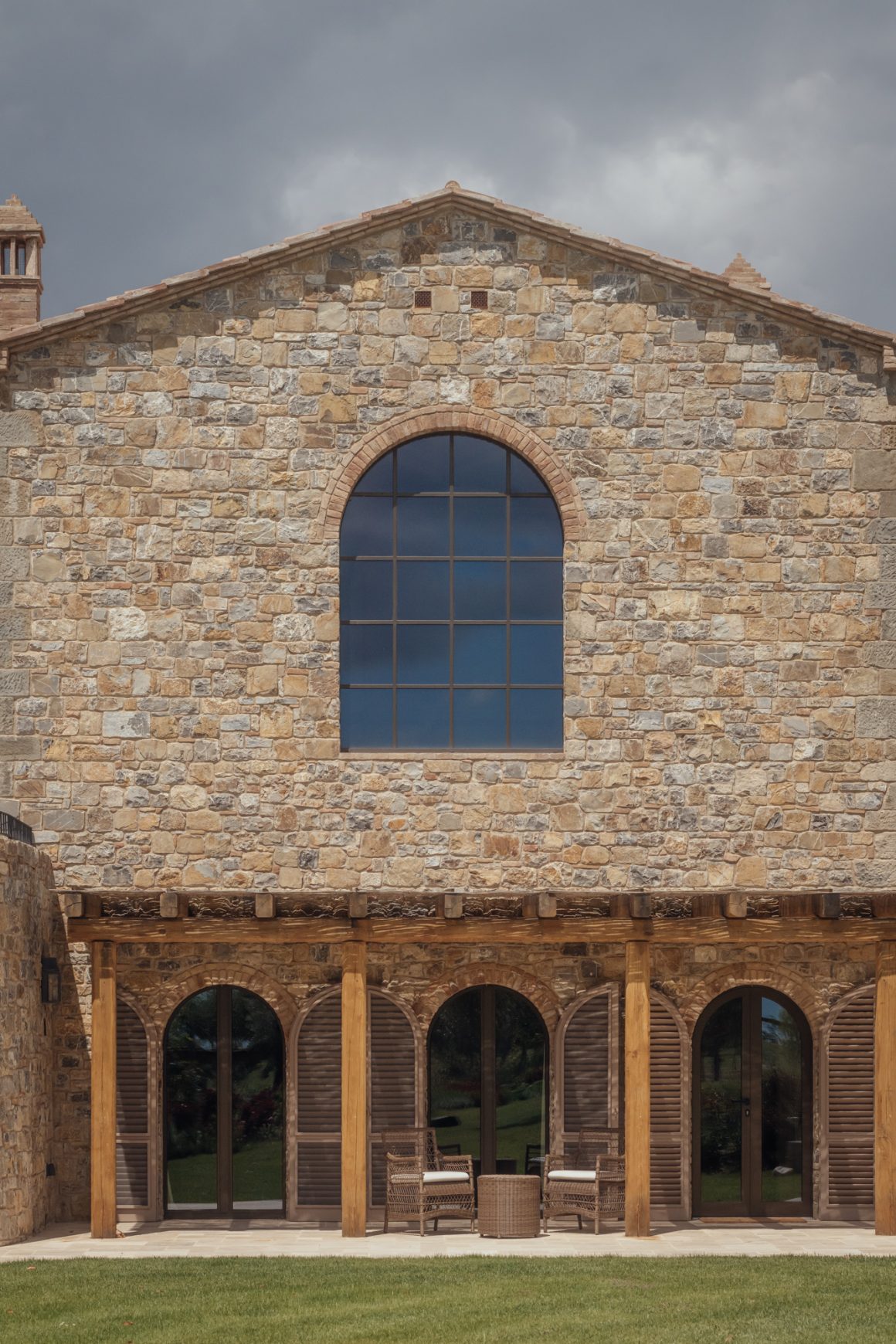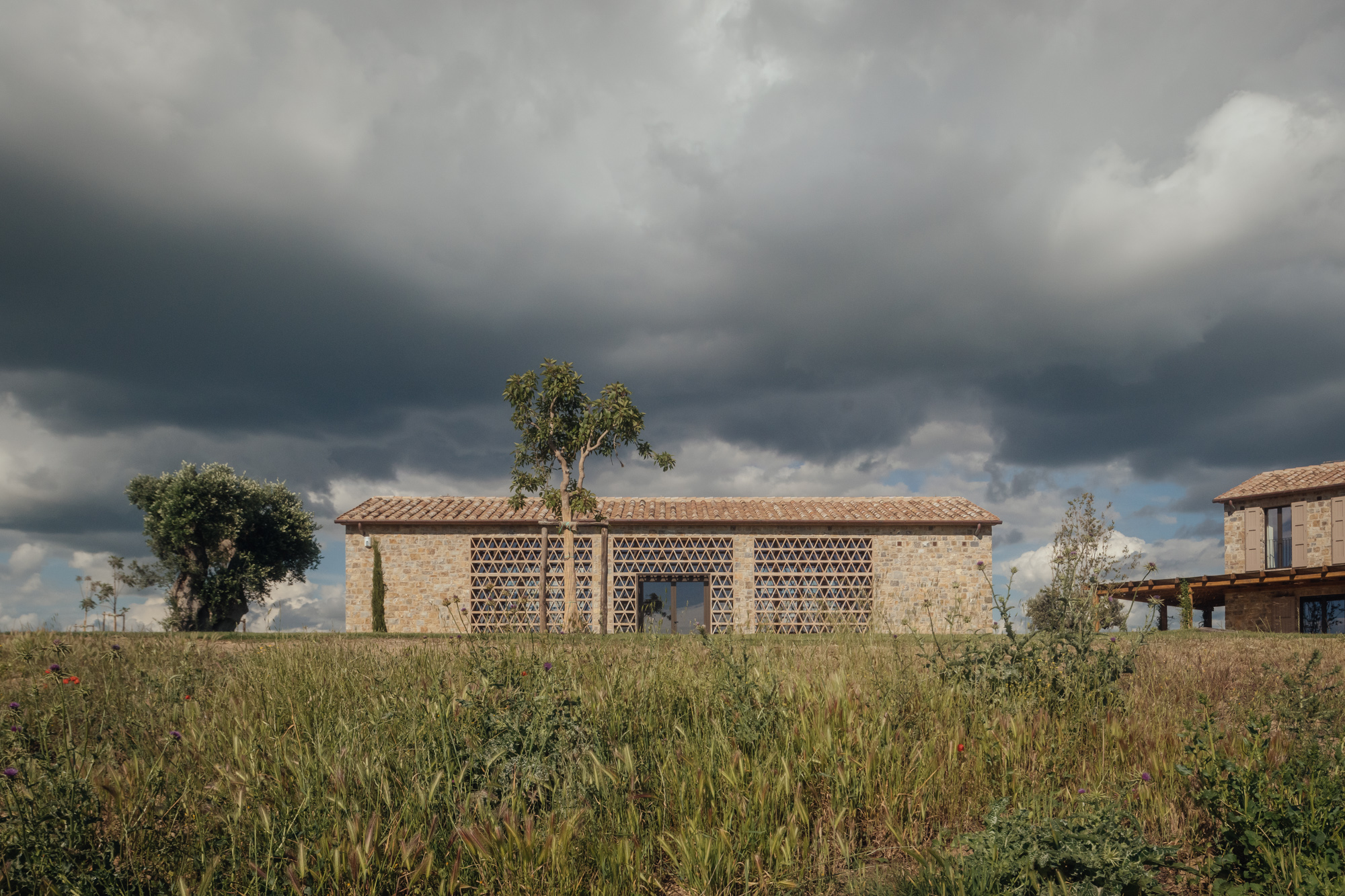 Όπως οι μορφές των κτιρίων της Τοσκάνης επηρέασαν τον σχεδιασμό, έτσι και τα υλικά αποτέλεσαν καθοριστικό στοιχείο. Οι λιθόκτιστοι τοίχοι, κατασκευασμένοι με πέτρα που προέρχεται απευθείας από το οικόπεδο, οι ρηχές κεραμοσκεπές και τα παραδοσιακά ανοίγματα, όπως το κεκλιμένο παράθυρο με πλακίδια του Αχυρώνα, αντικατοπτρίζουν την τοπική αρχιτεκτονική του Magliano. Ιταλικά πλακίδια, παράθυρα και υλικά τοπικής προέλευσης χρησιμοποιούνται με σκόπιμα παραδοσιακό τρόπο, προσδίδοντας στα κτίρια αίσθηση ηλικίας και οικειότητας, αποφεύγοντας μια εμφάνιση υπερβολικά καθαρή ή αυστηρά τακτοποιημένη.