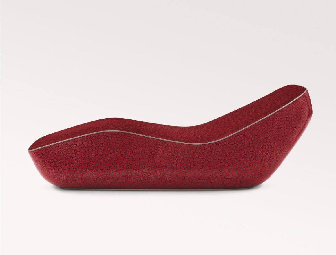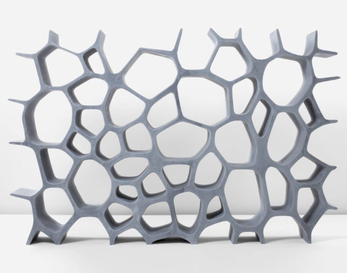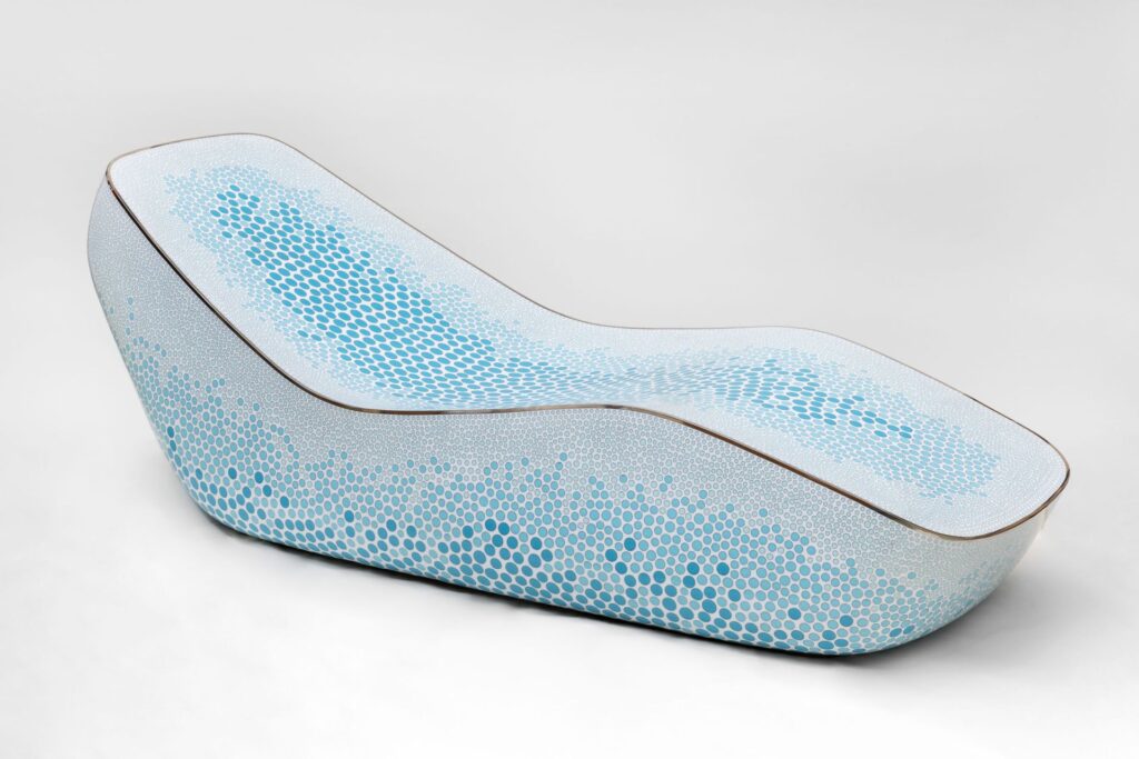 Newson’s practice moves fluidly between craft and engineering, tradition and advanced fabrication. From his early silversmithing experiments as a student to large-scale works realised through complex international collaborations, material remains central. Cloisonné enamel, an ancient technique rarely attempted at monumental scale, appears across chairs and chaise longues patterned in dense floral and spotted motifs, produced through a dedicated workshop established in China. Elsewhere, marble and Azul Macaubas stone are carved from single blocks into forms that seem improbably supple, their weight visually dissolved.