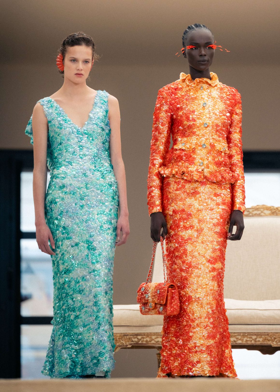 Perpetually in motion, from fluttering silk foulard ensembles and rustling raffia skirts to washed cotton canvas suiting, the essential enjoyment of dressing and undressing – the bathing suit is also key – guides the collection. Sensorially pleasurable and experimental, peerless fabrications echo the abundance of the surrounding natural world in fluid silks, springy tweeds, compact flocks, soft beaded knits, and shimmering fish-scale paillettes.