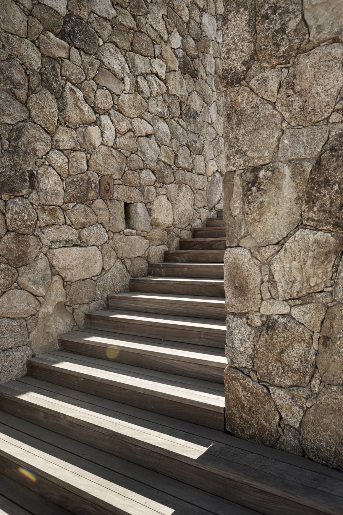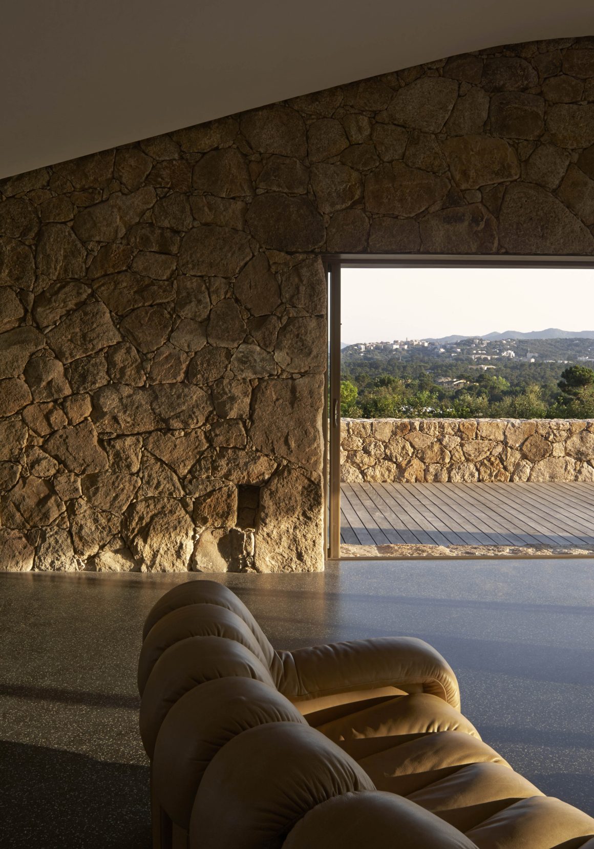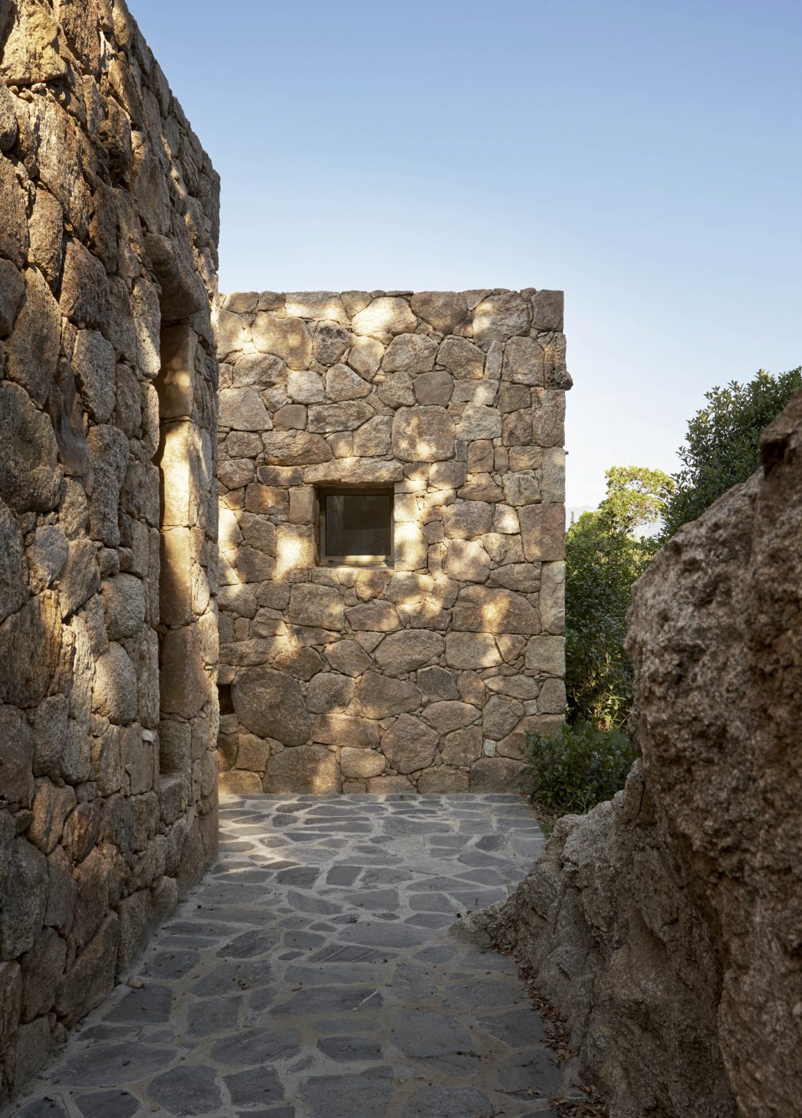 Just a few cobblestone-throws away from the sea, two straight walls of ocher rock crest over the cork oaks’ canopy, as rugged as the island terrain. Instead of sticking strictly to the villa’s saw-toothed profile, delineated by a pair of red-cedar-clad gable roofs, the downward slope of the walls hugs that of the hillside, helping the house blend into the landscape.