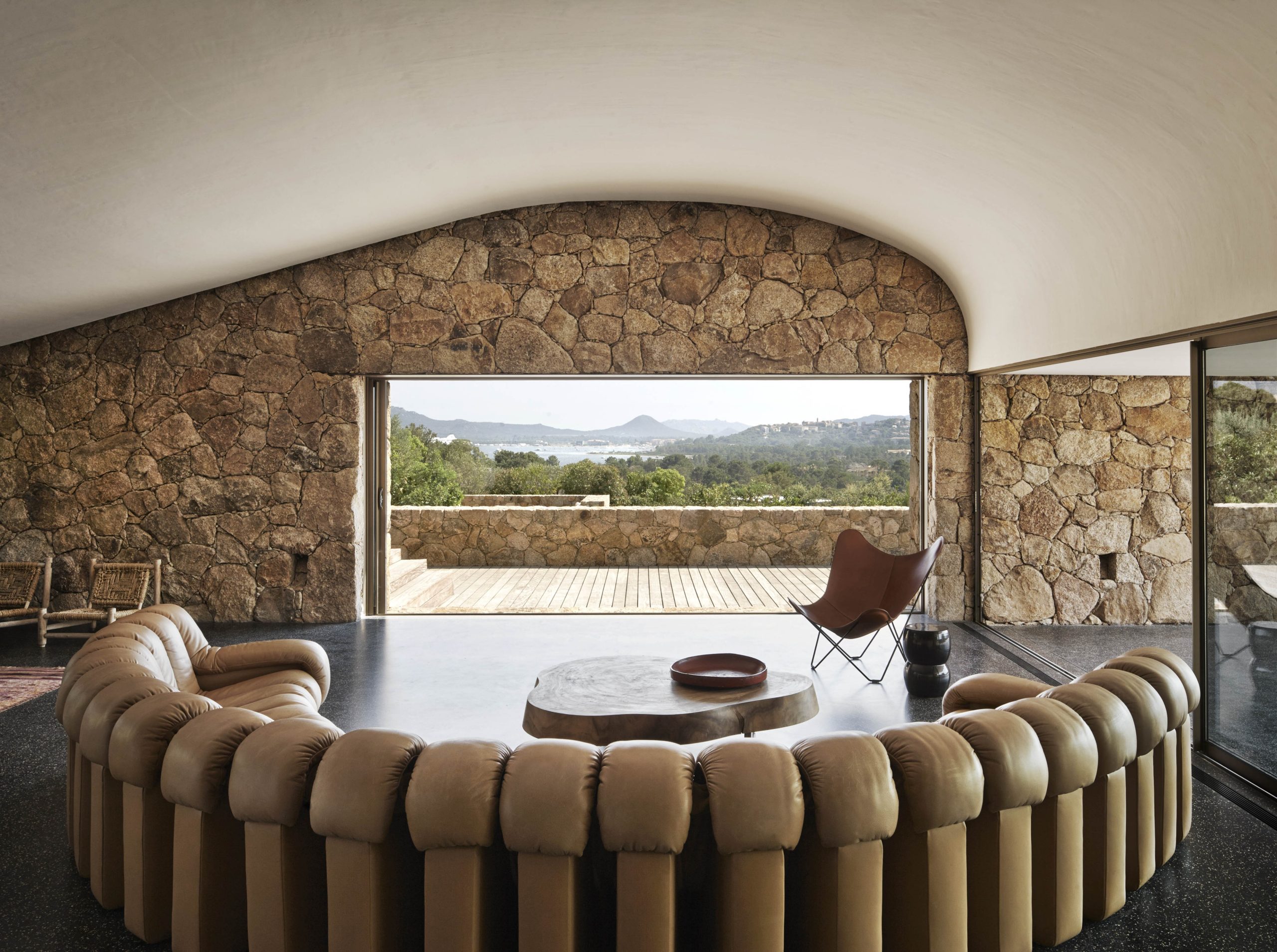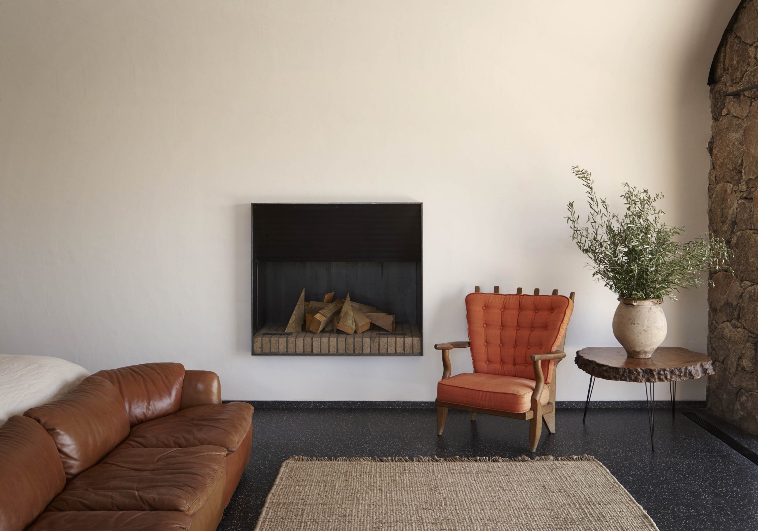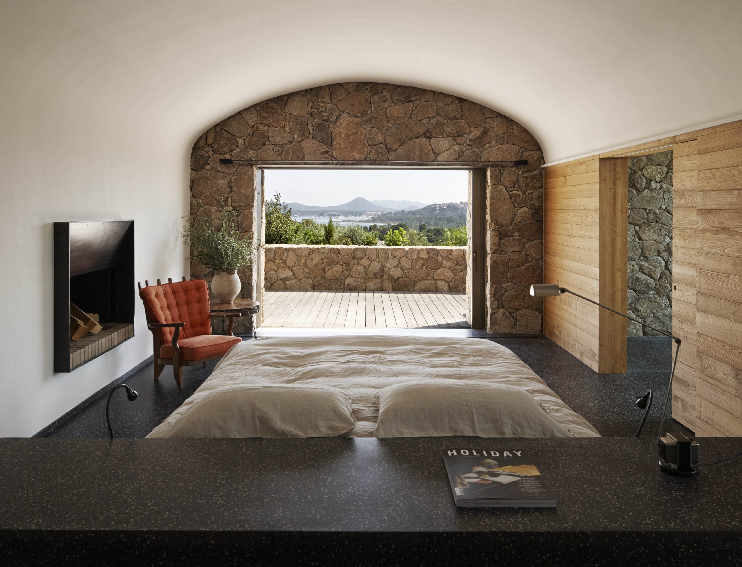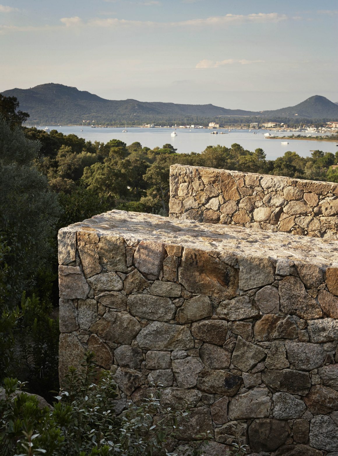 Just a few cobblestone-throws away from the sea, two straight walls of ocher rock crest over the cork oaks’ canopy, as rugged as the island terrain. Instead of sticking strictly to the villa’s saw-toothed profile, delineated by a pair of red-cedar-clad gable roofs, the downward slope of the walls hugs that of the hillside, helping the house blend into the landscape.