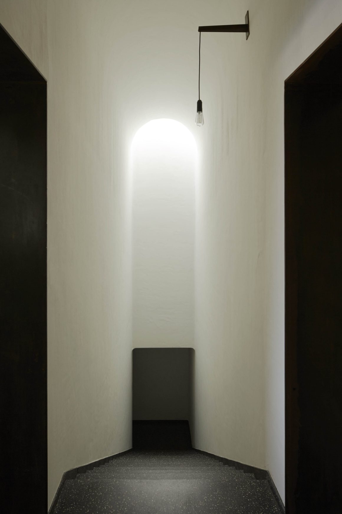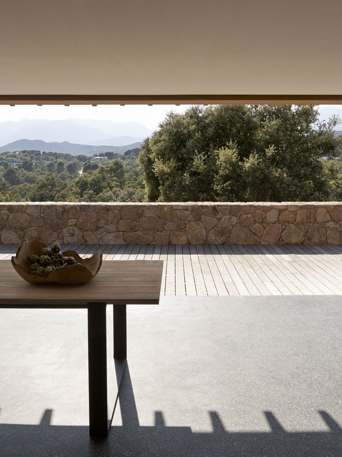 From this main level, a flared gallery unfurls its steps down to the garden level—a stone pedestal housing four guest bedrooms, their bathrooms, and the kitchen—and enables access to a slender pool whenever the sun shoots its rays with excessive ardor. Its light-colored lining contrasts with the indoor floors, as dark as lava, while the gable roofs allow for vaulted ceilings in the living room and master bedroom. The classic Corsican house’s essence LS thus reprised and revisited, further anchoring the project in its context. Contemporary yet traditional, light yet dark, protective and massive from the south yet open and porous from the west, the villa ultimately finds its identity in the splits of its personality.