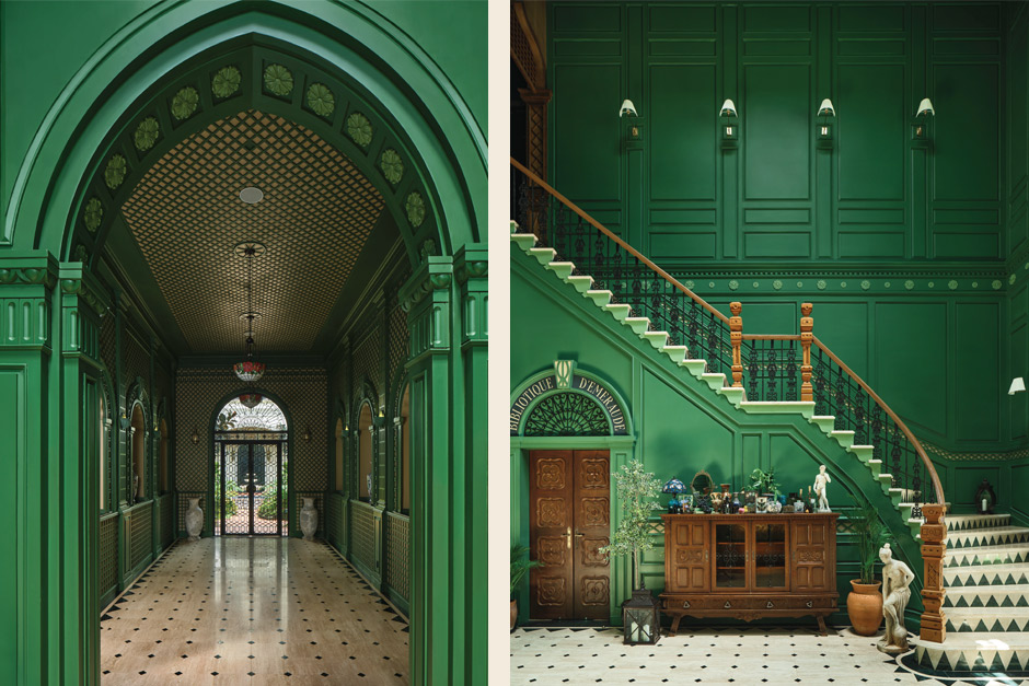 Inside, the interiors unfold with sculptural precision. Public spaces blend soft modernism with whimsical classicism, where limestone and warm woods are paired with botanical curiosities and brushed metal details. Light filters through rattan screens and dances across polished terrazzo floors, shaping an atmosphere that feels almost cinematic in its quietude.