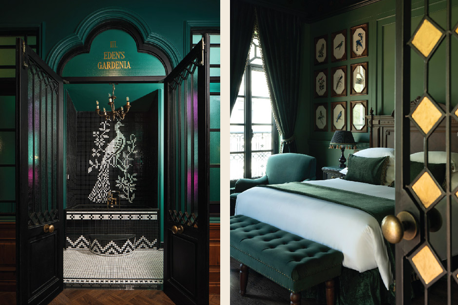 Culinary spaces unfold as extensions of the hotel’s storytelling. The Vivarium, the hotel’s signature restaurant, feels like dining inside an ethereal conservatory—where seasonal Thai ingredients are elevated with contemporary finesse and served amid soft light and garden views. Nearby, The Botanist’s Bible offers a more introspective pause, a salon de thé where afternoon tea is accompanied by vintage botanical illustrations and a sense of hushed elegance. As twilight deepens, Bar Mystère becomes the hotel’s most enigmatic setting, a moody chamber where imaginative cocktails and refined spirits mirror the dreamlike mood of Maison Mystique itself.