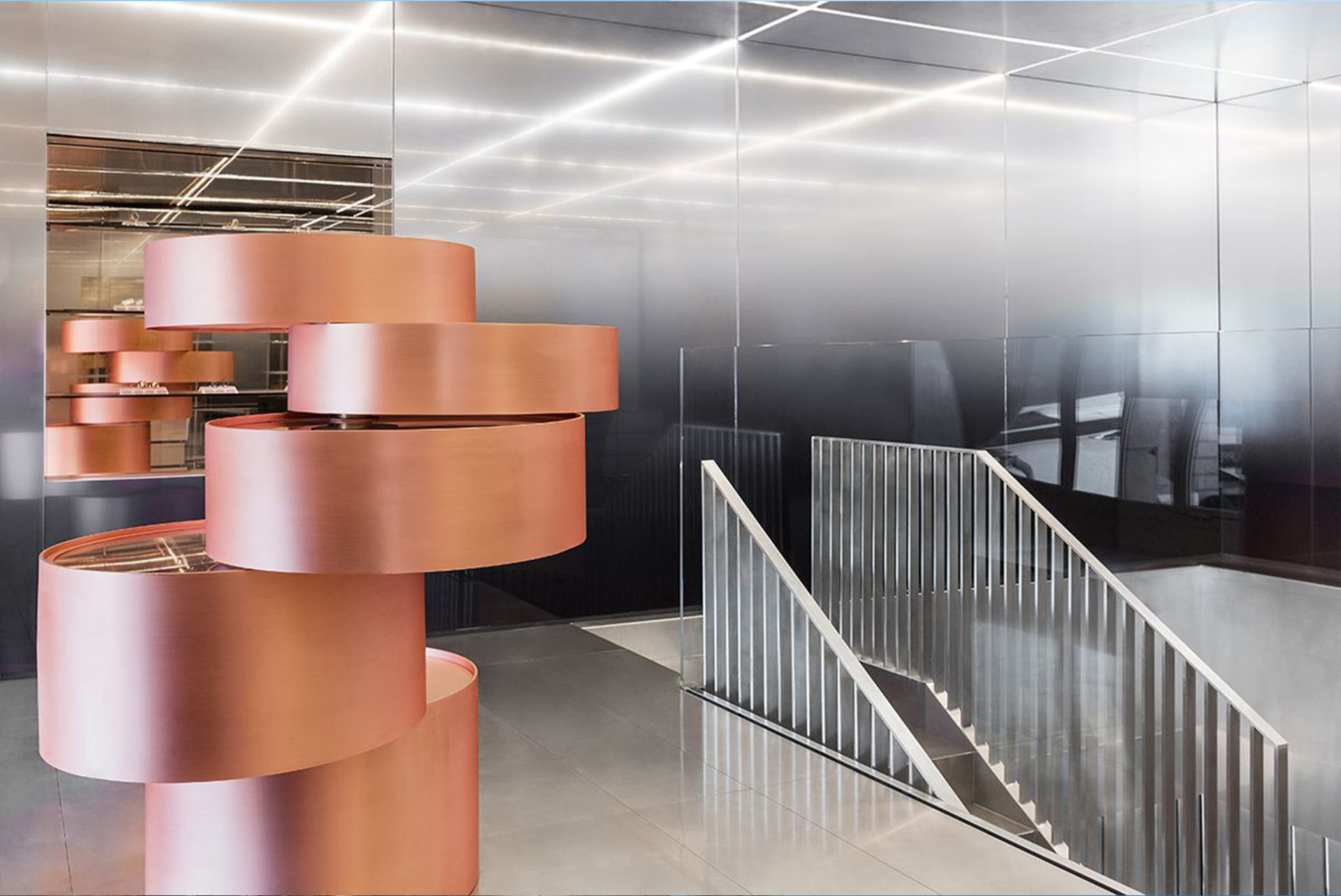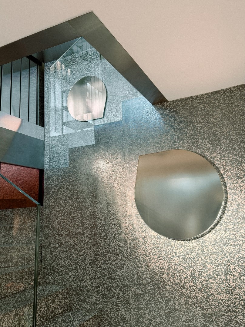 Mirrors in unique shades, developed in collaboration with Dutch artist & designer Sabine Marcelis, introduce subtle degrees of reflection and chromatic refractions. The luminous pink gradients and smoky blue mirrors, inspired by 1980s aesthetics, envelop the boutique in an aura that is both sensory and contemporary.