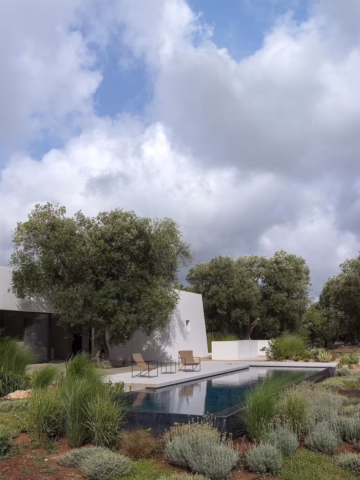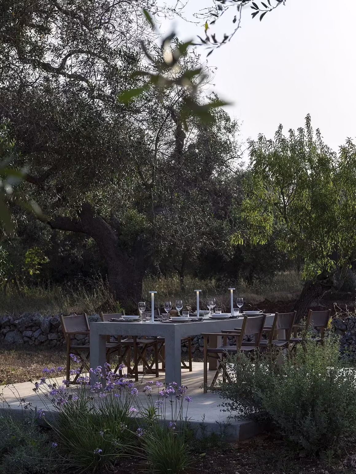 Designing in such a setting was approached with care: building in nature can feel like an intrusion, a disruption that must be gently healed. The project was therefore guided by respect for the land—preserving every tree and integrating them as essential elements of the design. These olive trees provide natural protection from wind and sun, offering shade, filtering light, and allowing air to circulate softly throughout the spaces.