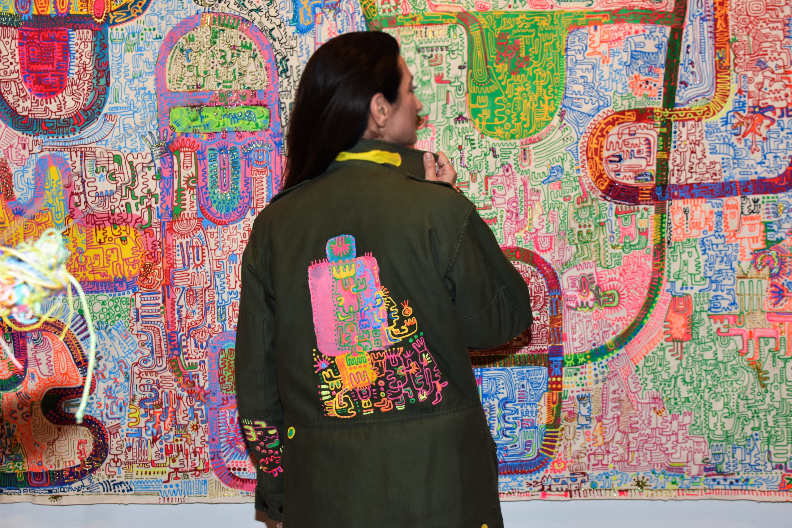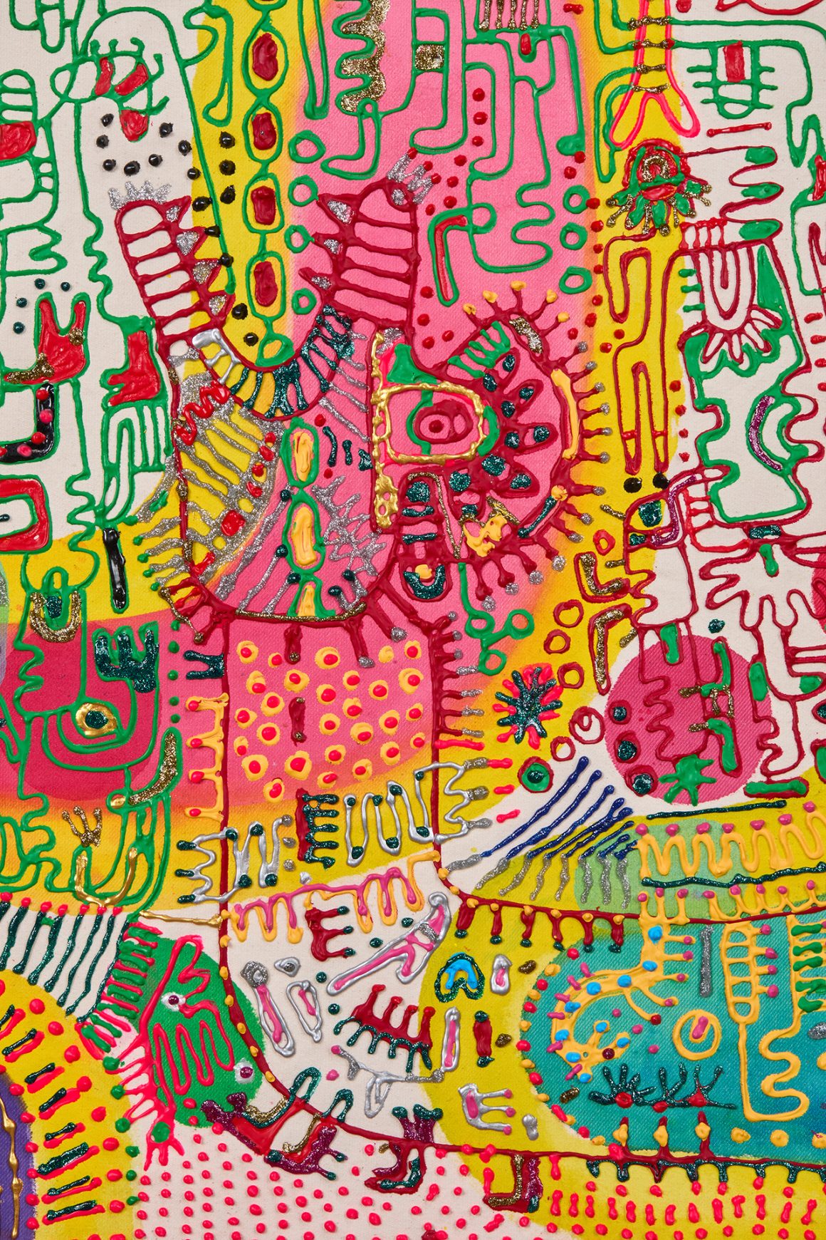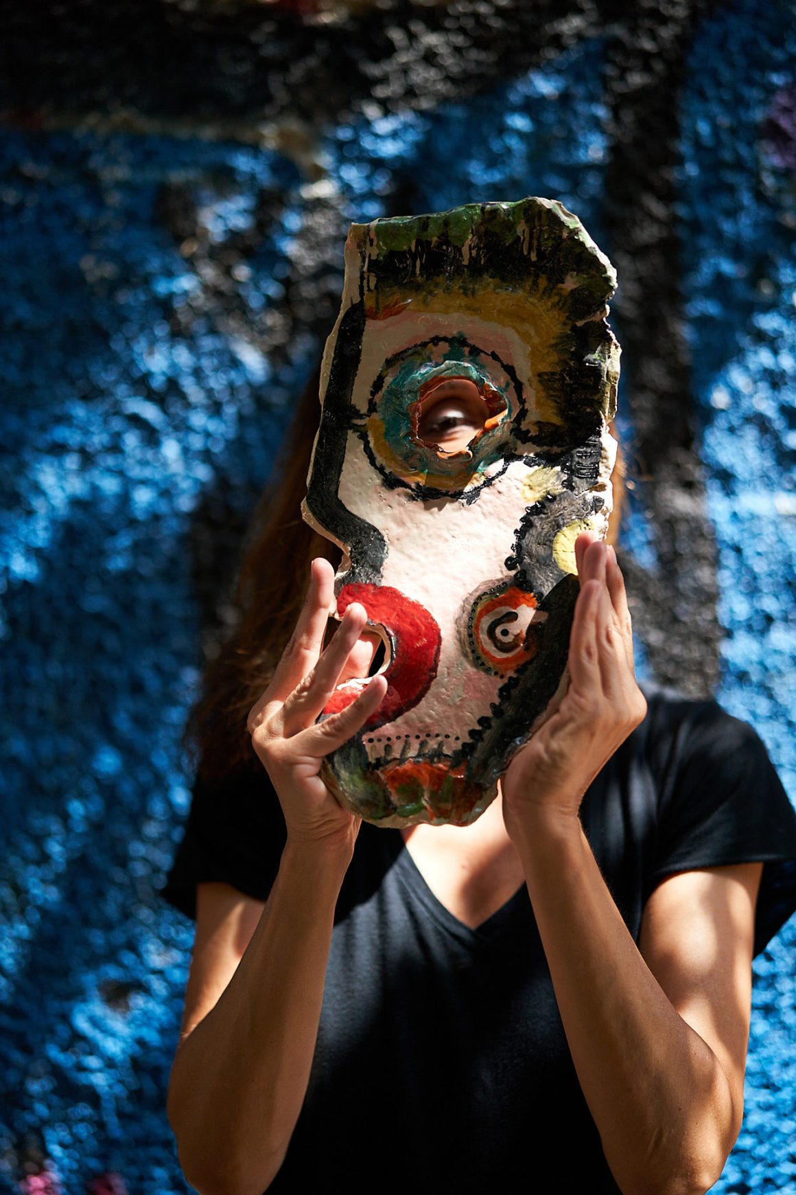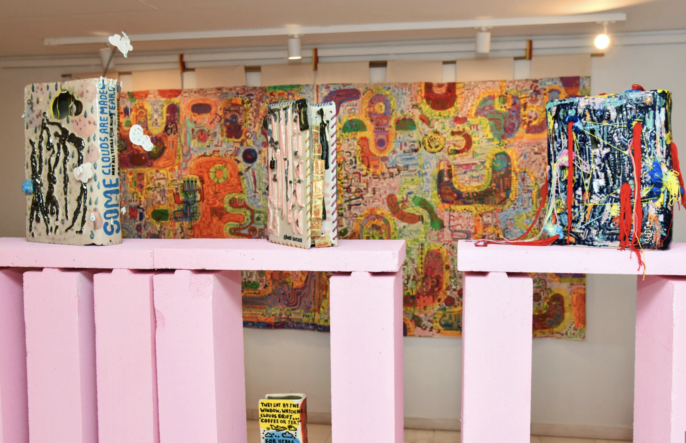 All the works were created almost simultaneously. They are not phases I passed through as an artist. My intention is to present my personal journey toward freedom, my own spring. A reunion with little Leonie and with ancestral fragments of myself. All of them tesserae of my own mosaic. Threads that connect me to the world within translated into works of ceramics, sculpture, and painting, including the ritual banners I present for the first time. Multicolored narrative stories painted on sailcloth.